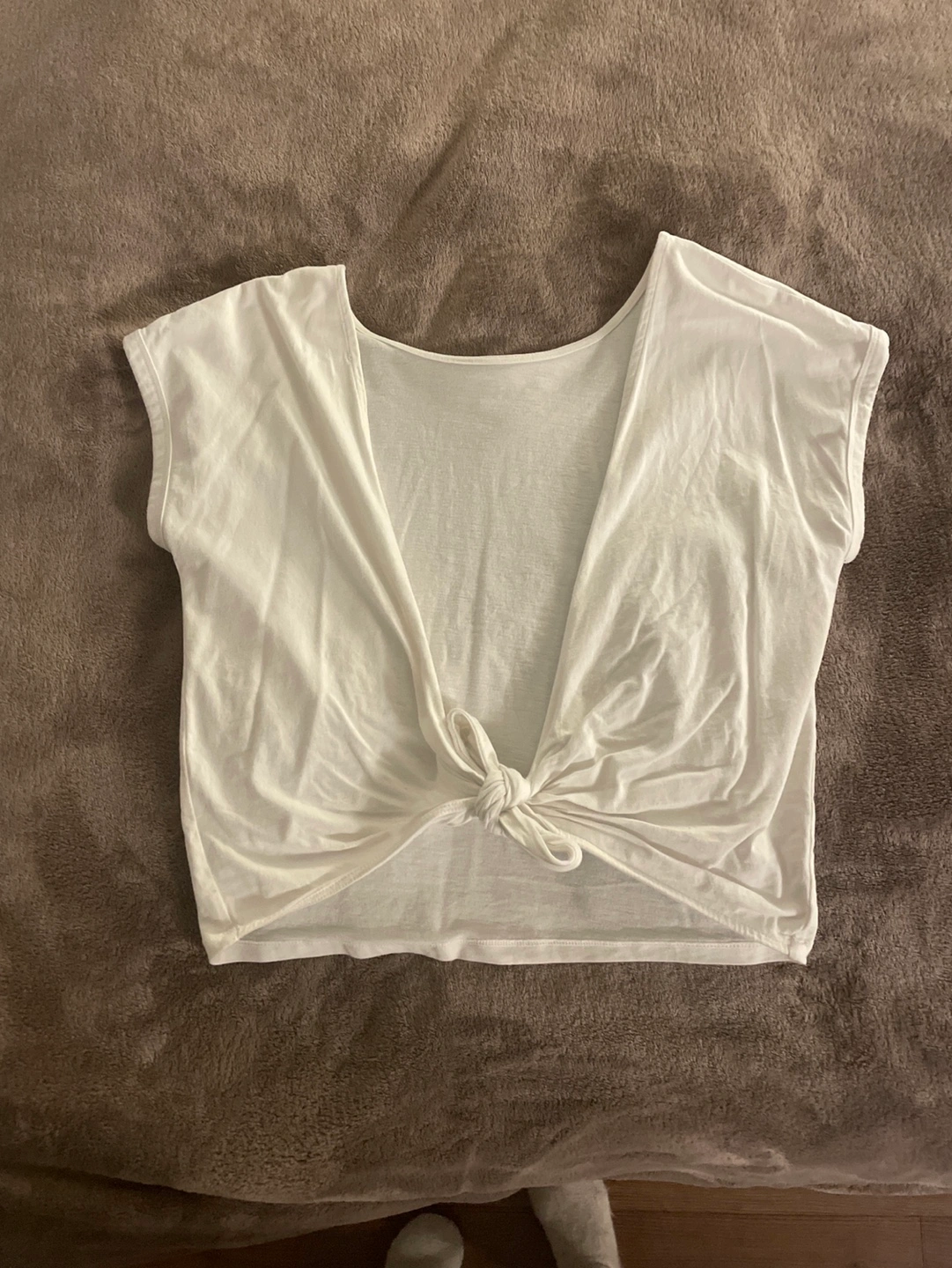 Women's cropped t-shirt. White, size small. Short sleeves. Tie detail at back.