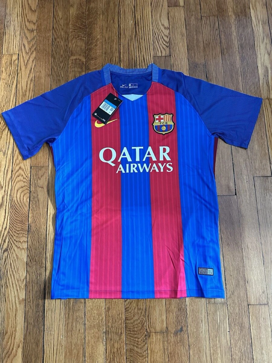 Men's size large FC Barcelona soccer jersey. Blue and red vertical stripes. Qatar Airways sponsor logo. New with tags.size L