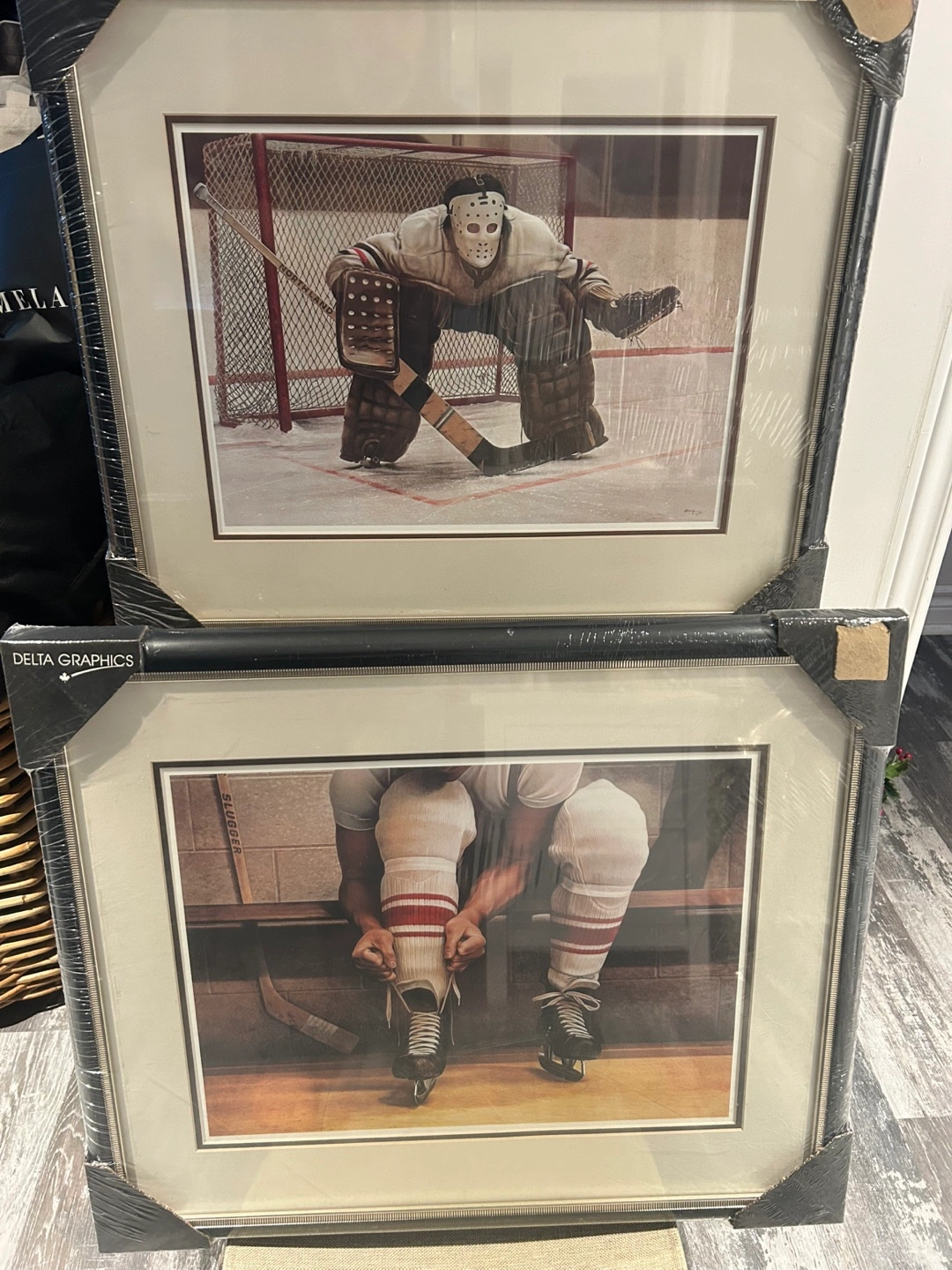 Two framed hockey prints. One depicts a goalie in action, the other shows a player tying their skates. Black frames, matted prints. New, still in plastic.