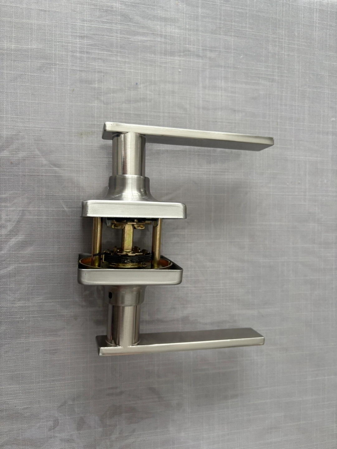 New Unused door lever set. Brushed nickel finish. Square design. Includes all parts shown. For interior doors.