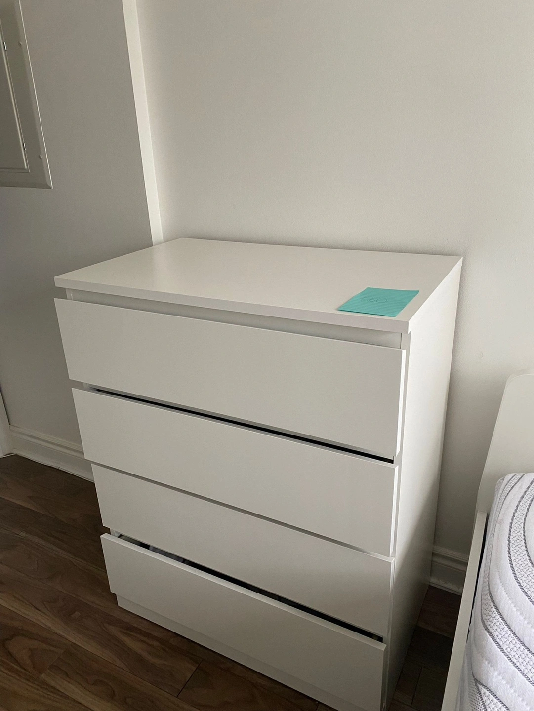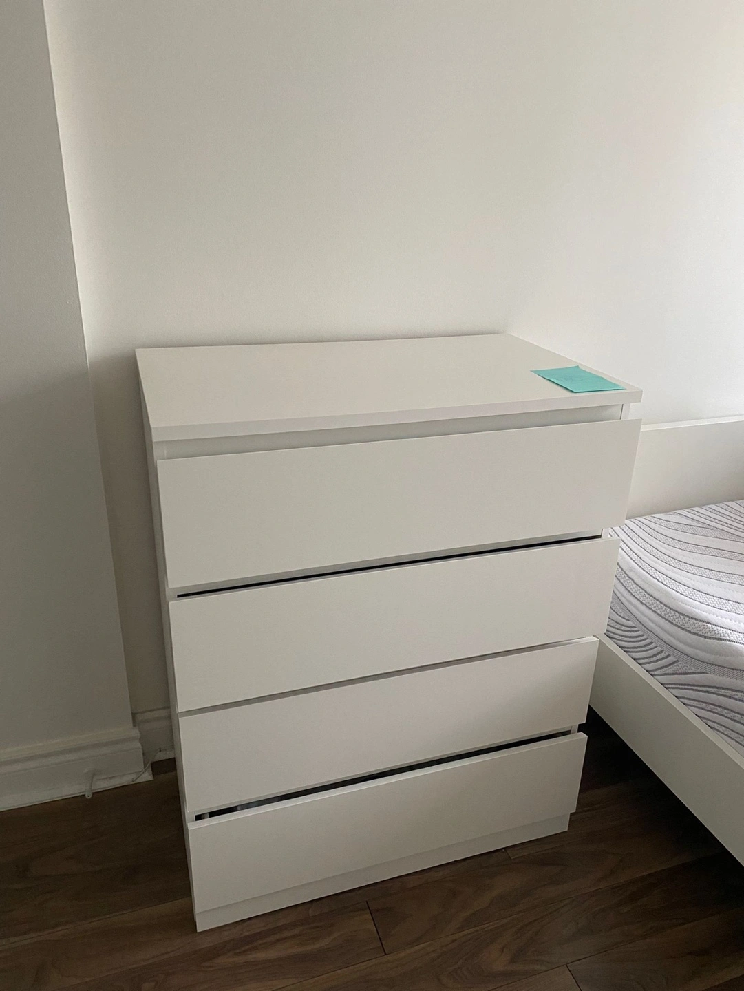 Clean, modern white dresser. Four spacious drawers. Great for bedroom storage. Minimalist design.