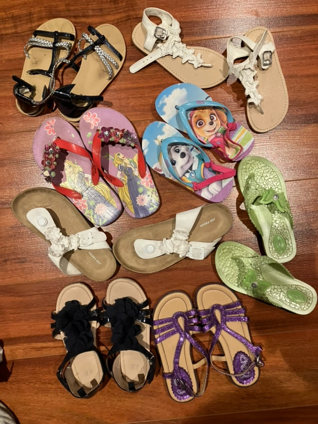 Large bundle of girls' sandals and flip-flops. Various styles, colours, and brands. Sizes range from approximately 8 to 10. Great value for a variety of summer footwear.