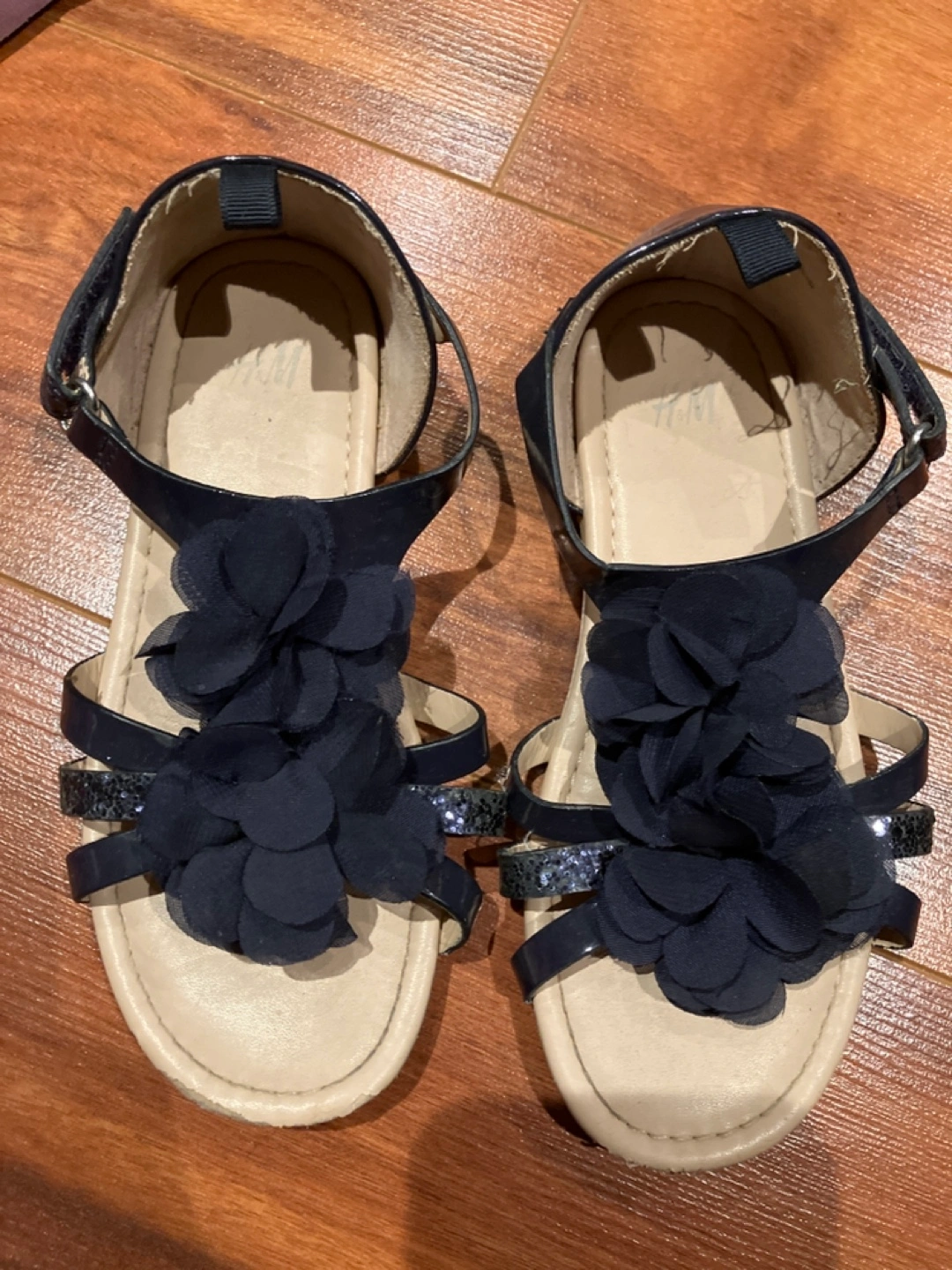 Cute navy blue sandals. Features flower embellishments. Good for summer. Size 9. Some wear and tear.