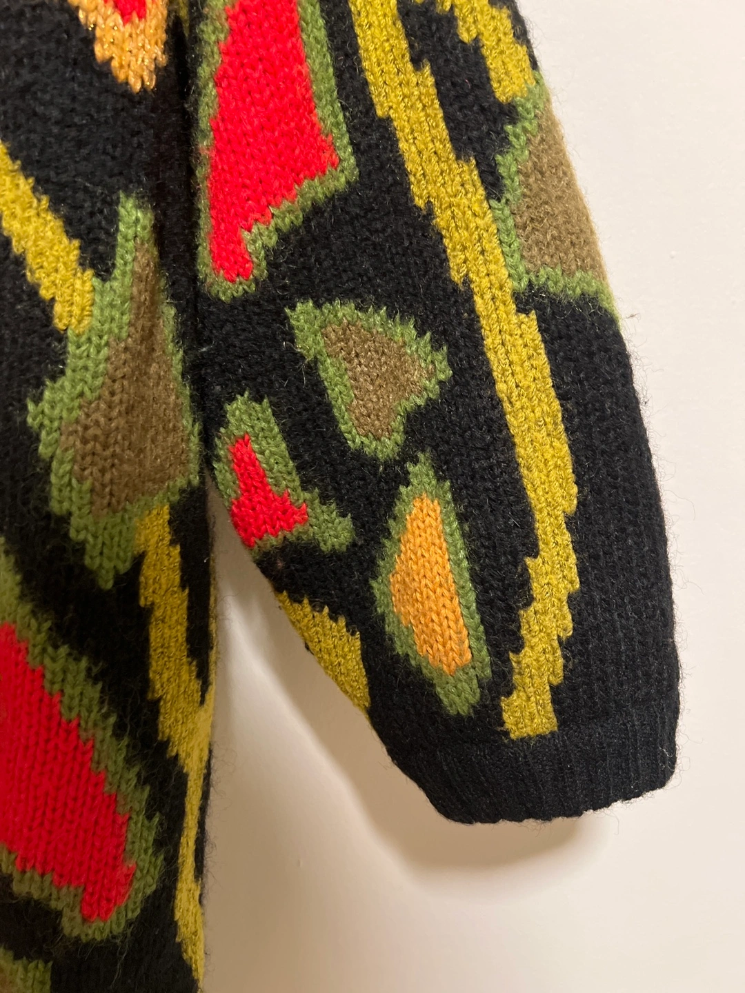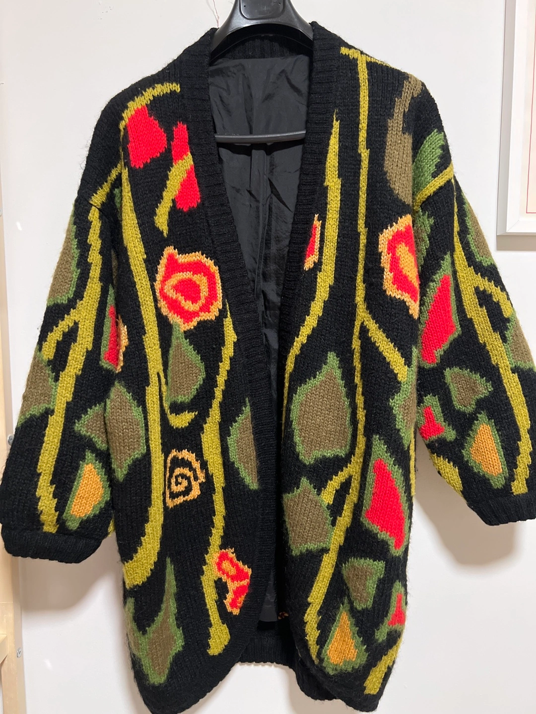 Black cardigan, three-quarter sleeves. Features a colourful floral pattern in red, orange, yellow, and green. Open front. Soft knit material.