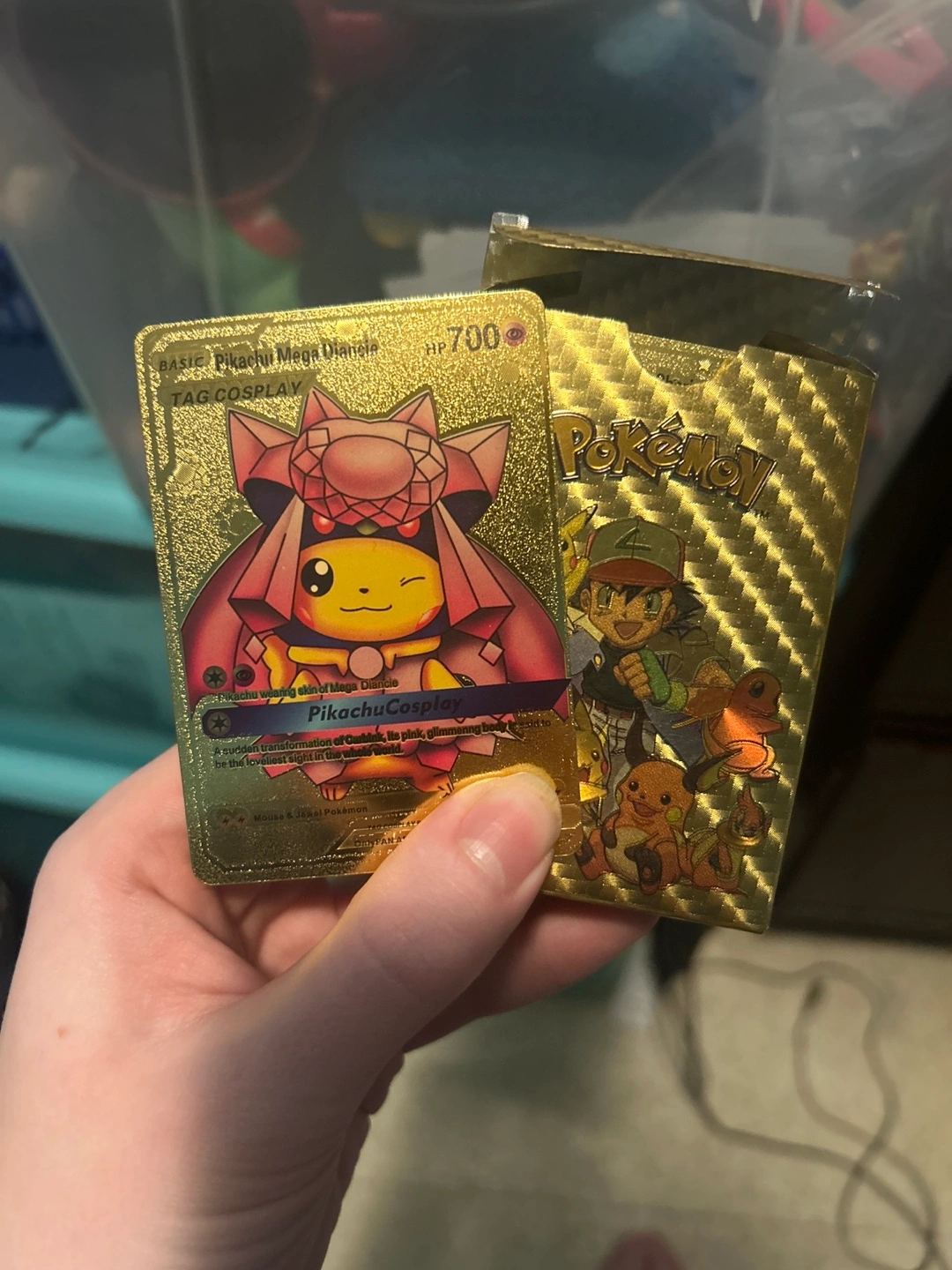 Gold Pokémon card featuring Pikachu in a Mega Diancie costume. Comes in a gold pack as well. Collectible card.