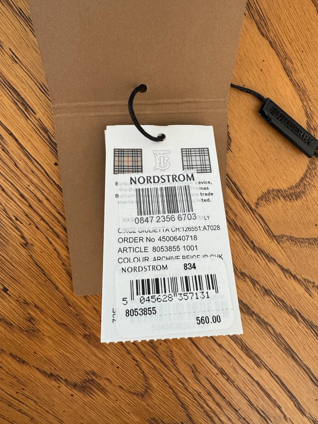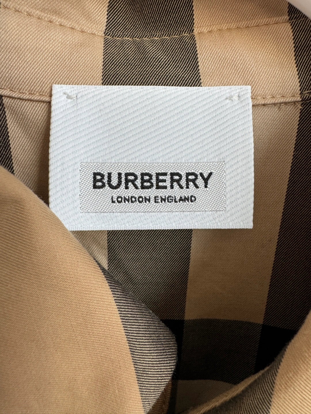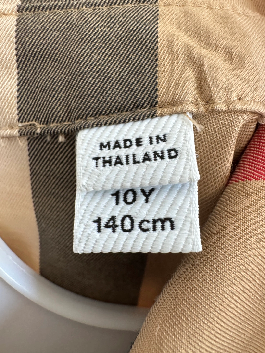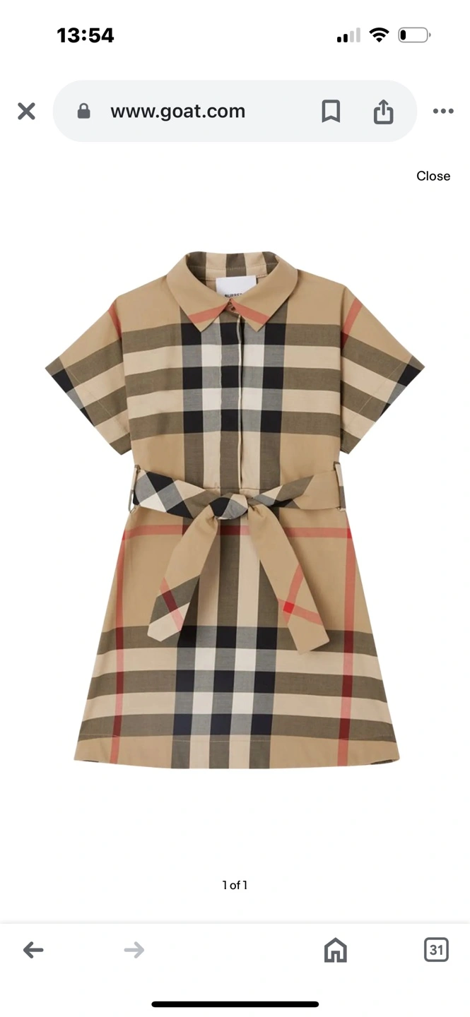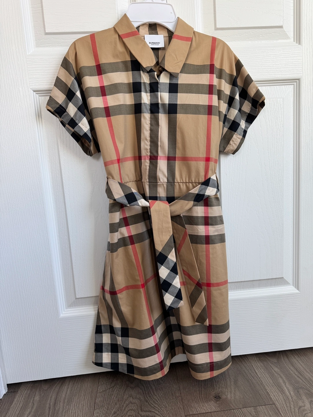 Adorable Burberry dress. Beige and brown plaid pattern. Short sleeves. Self-tie belt. Great for special occasions.
