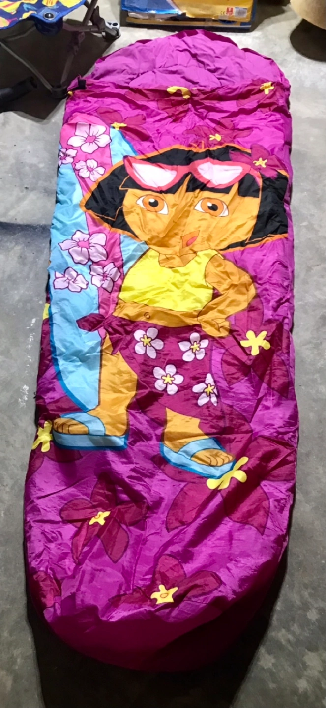 130Purple kids sleeping bag. Features Dora the Explorer surfing. Great for sleepovers or camping. Lightweight and easy to pack.