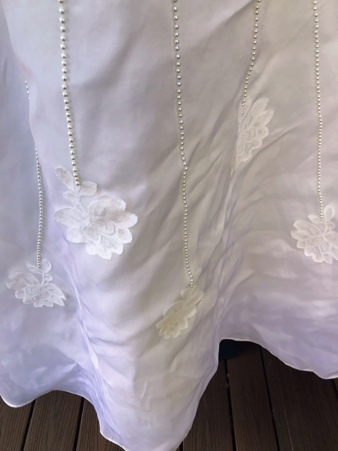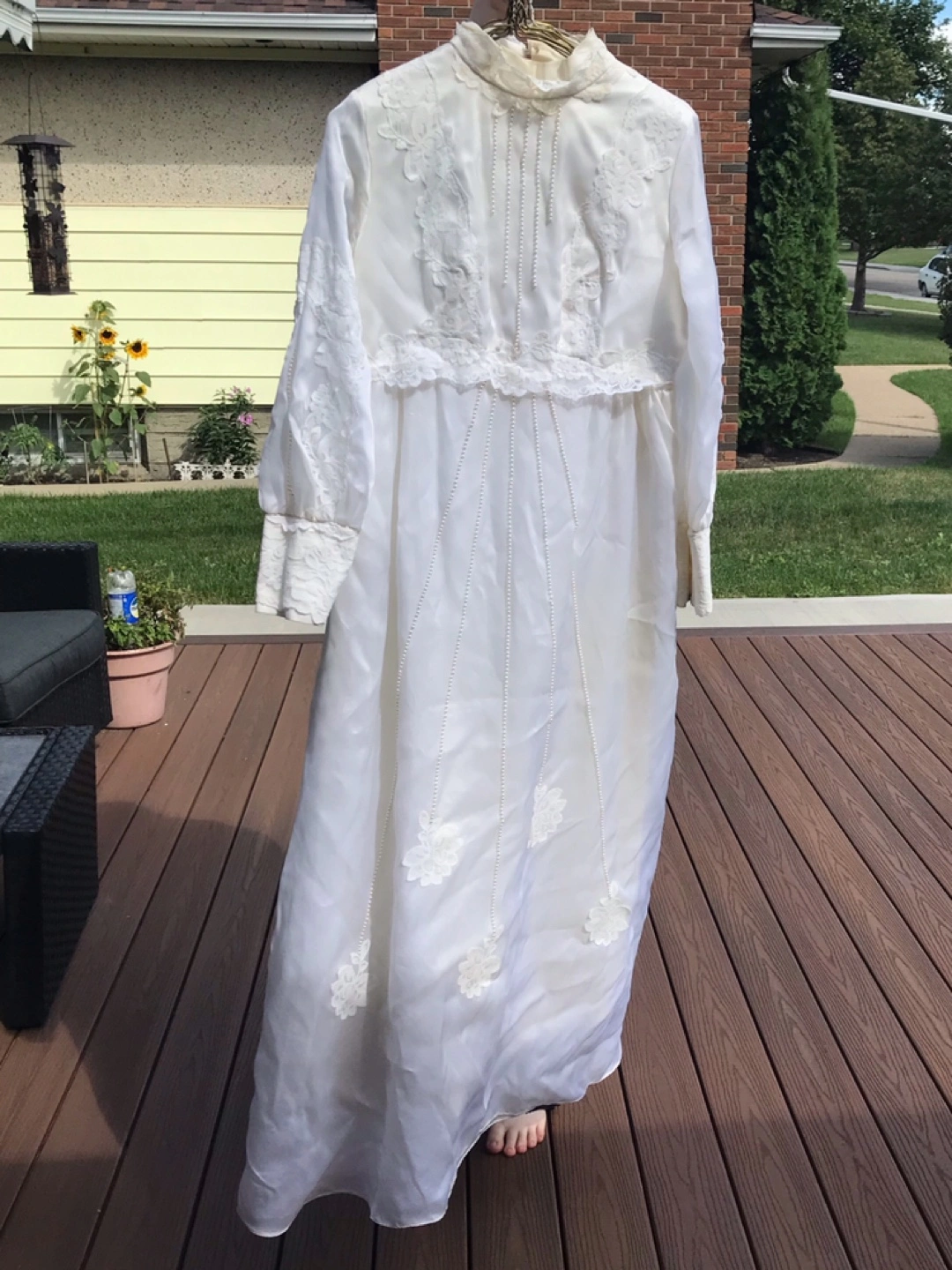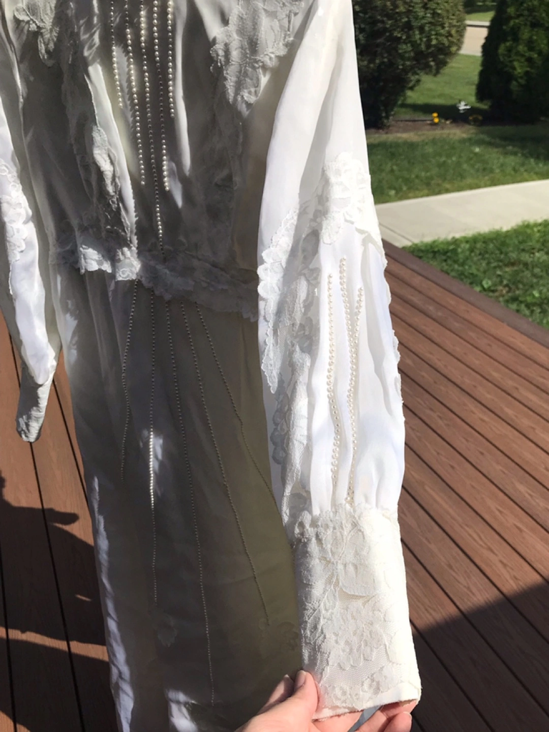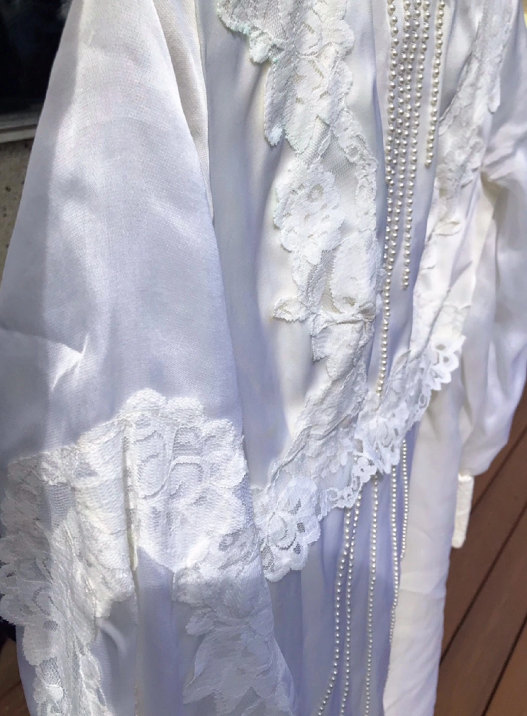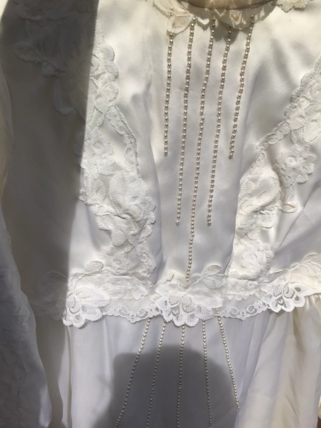 Costume “wedding gown.” Elegant vintage floor-length dress. Features long sleeves, high neck, and intricate lace accents. Decorated with pearl beading down the centre. Light weight makes it excellent teen Halloween costume.