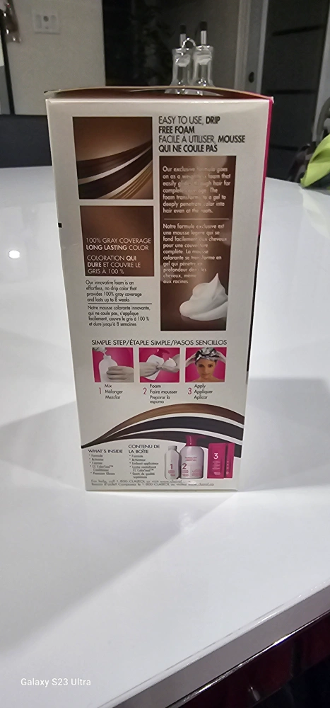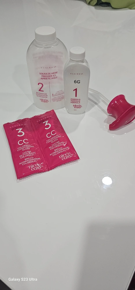 New Clairol Nice'n Easy foam hair colour. Shade 6G, medium golden brown. Includes colour, developer, and conditioner. Easy to use foam formula. 100% grey coverage.