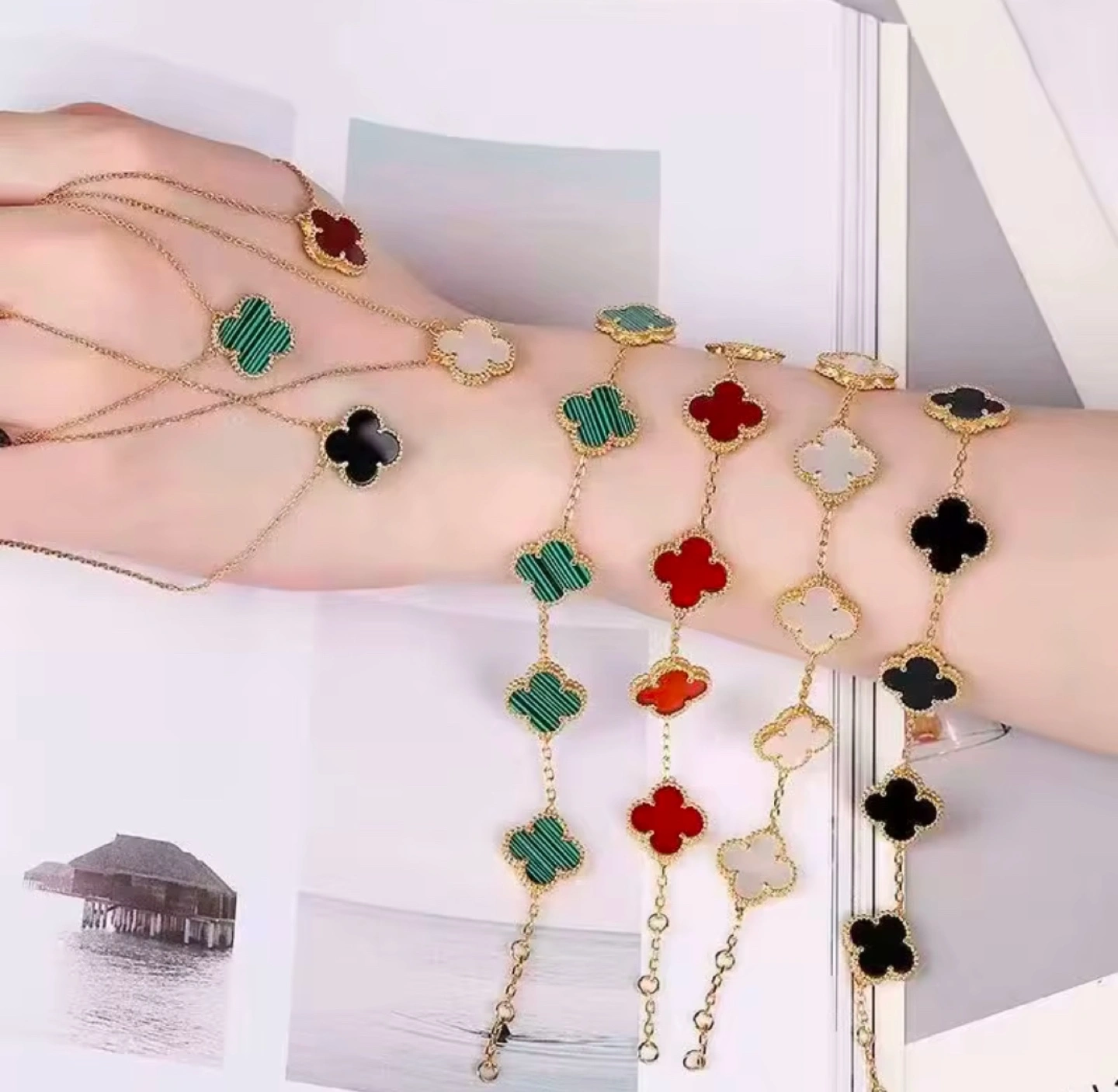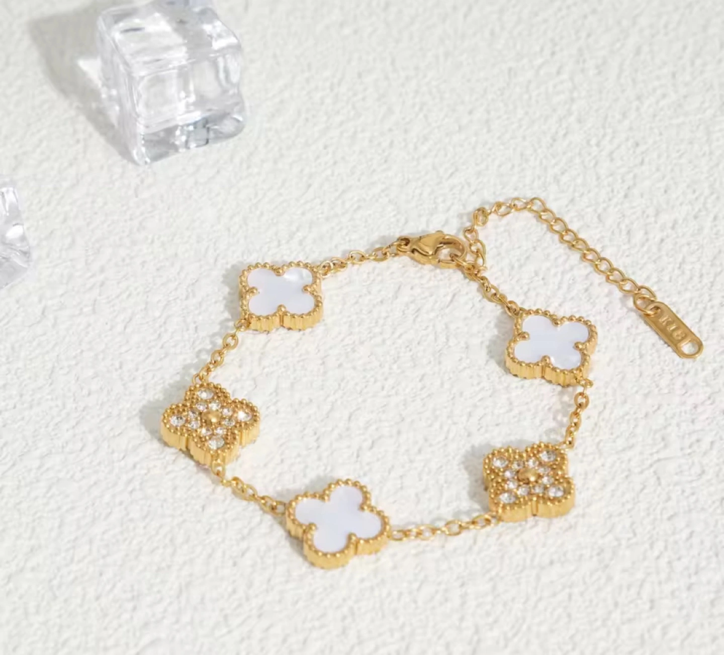 Beautiful gold bracelet featuring four clover-shaped stones. Various colours available. Delicate chain. Lobster clasp. Perfect for layering or wearing alone.