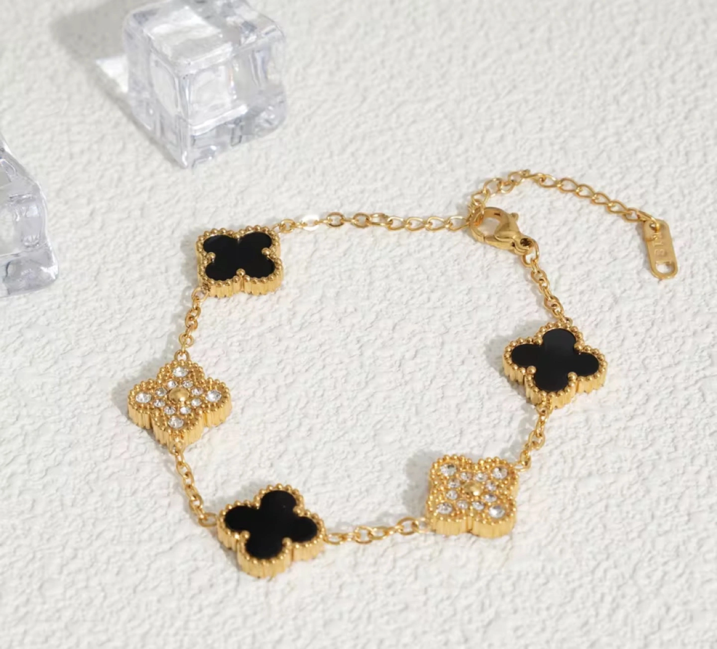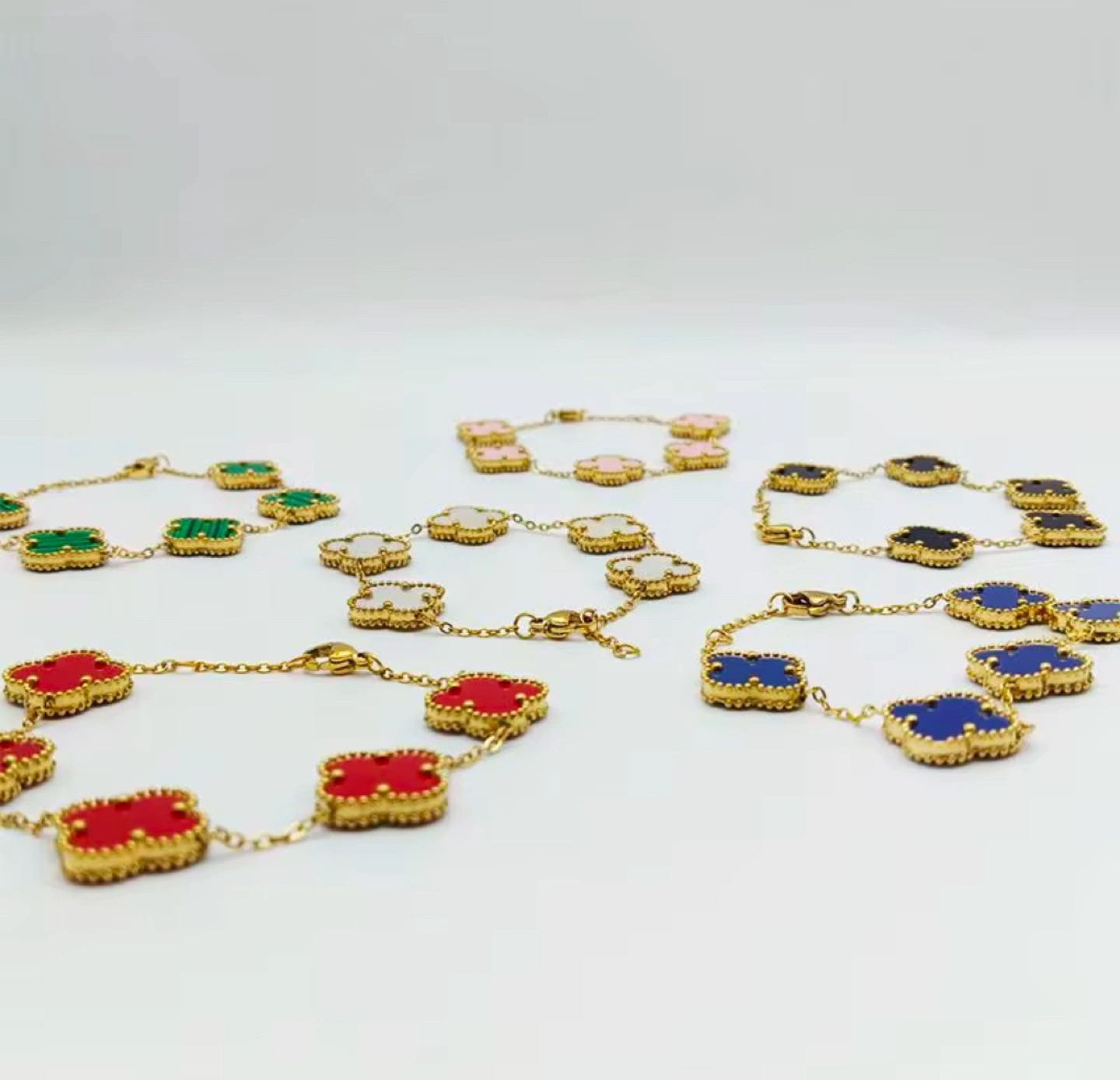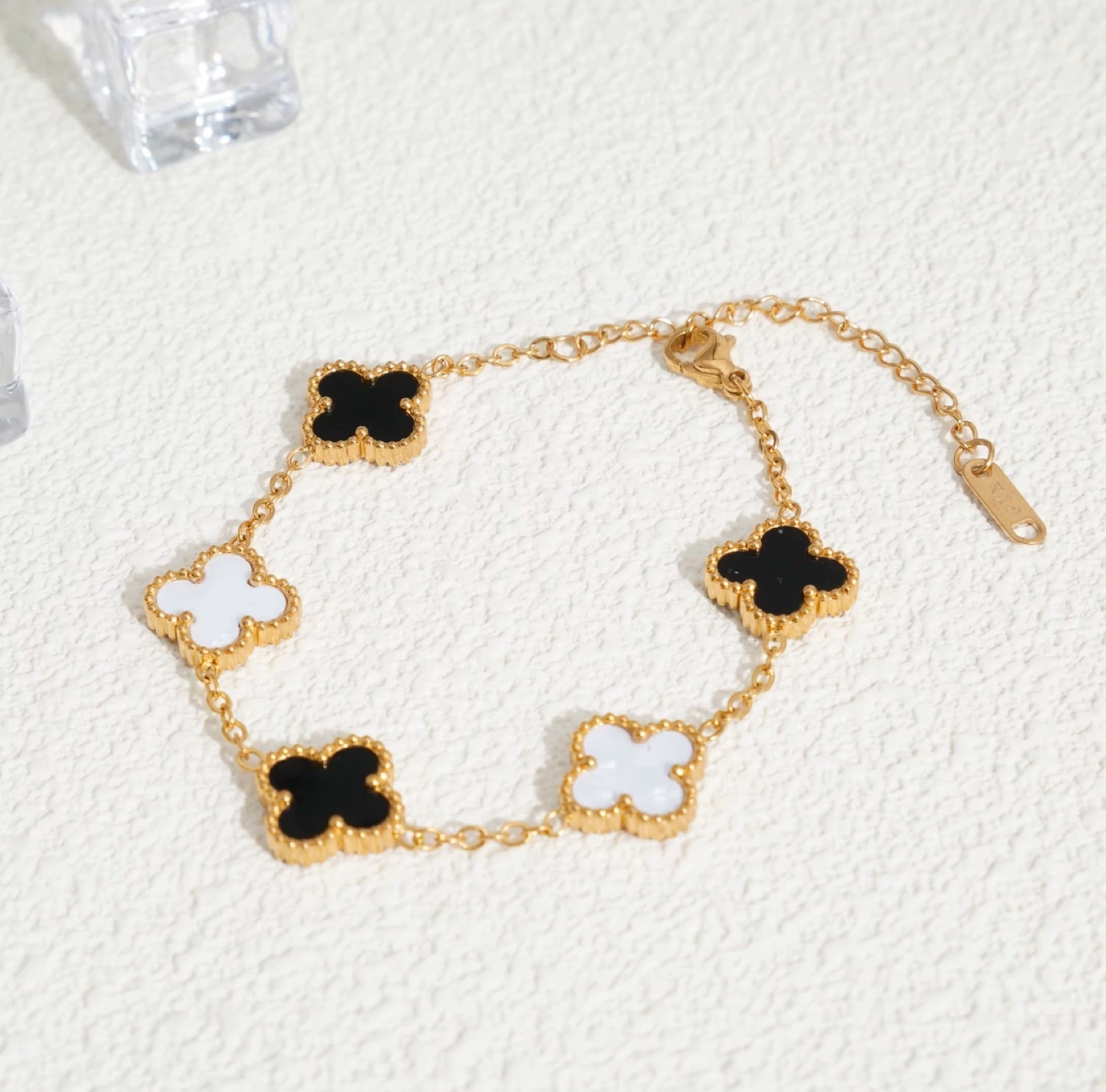 Beautiful gold bracelet featuring four clover-shaped stones. Various colours available. Delicate chain. Lobster clasp. Perfect for layering or wearing alone.