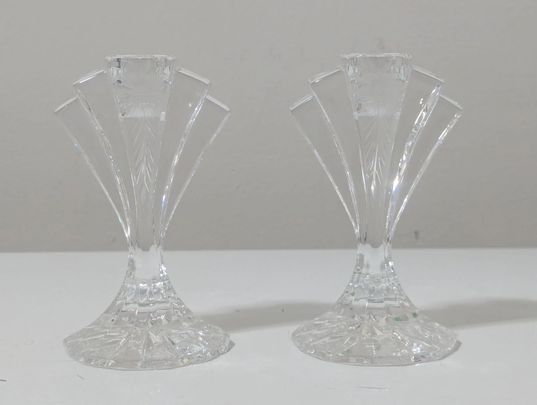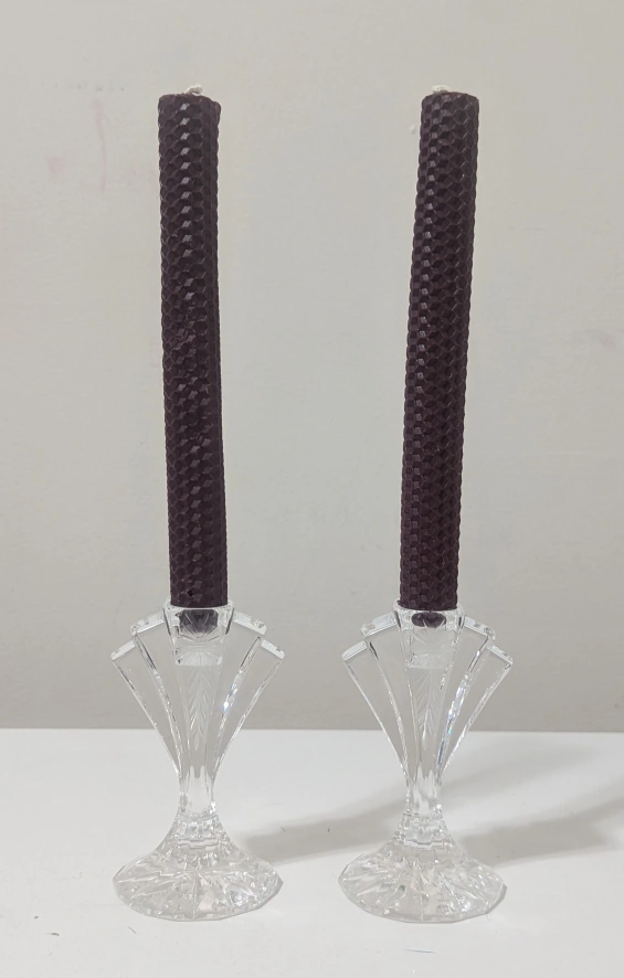 Elegant pair of crystal candle holders. Intricate cut glass design. Includes two dark burgundy and four extra candles.