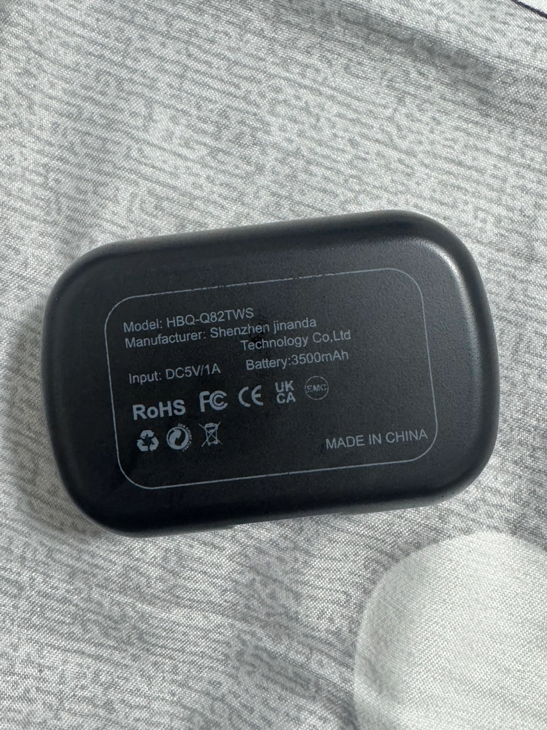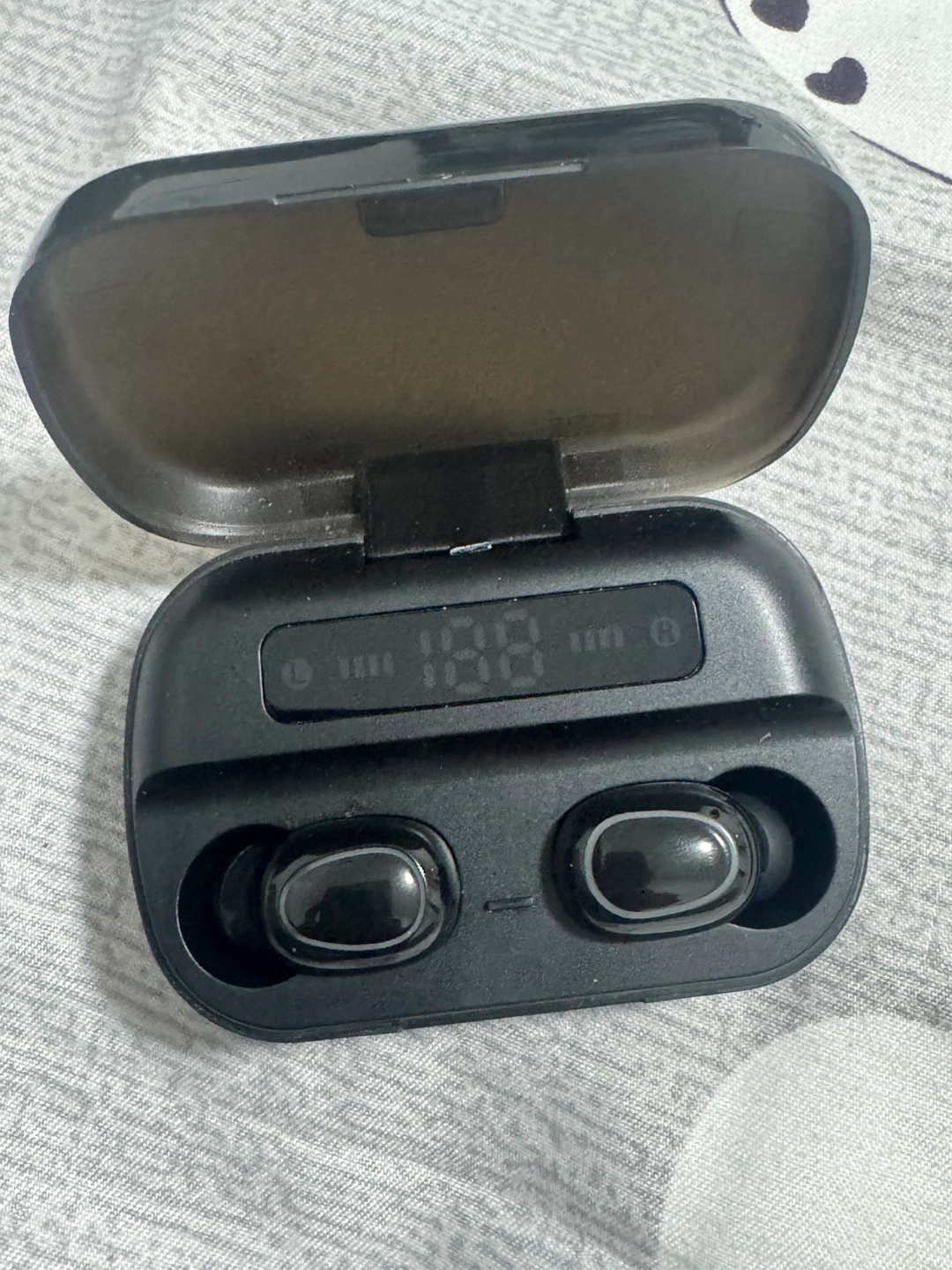 39Black wireless earbuds. Charging case included. Digital battery display. 3500mAh battery. Made in China.