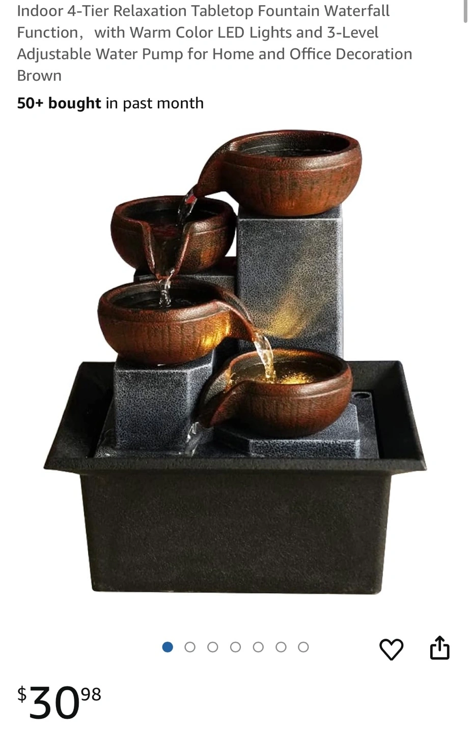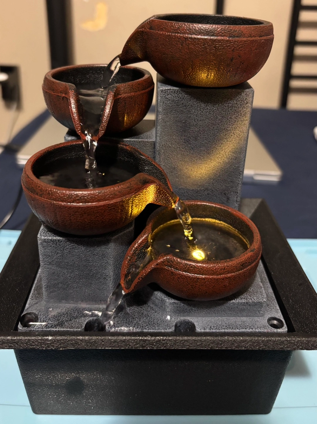 Relaxing 4-tier fountain. Features warm colour LED lights and 3-level water pump. Ideal for home or office decor.
