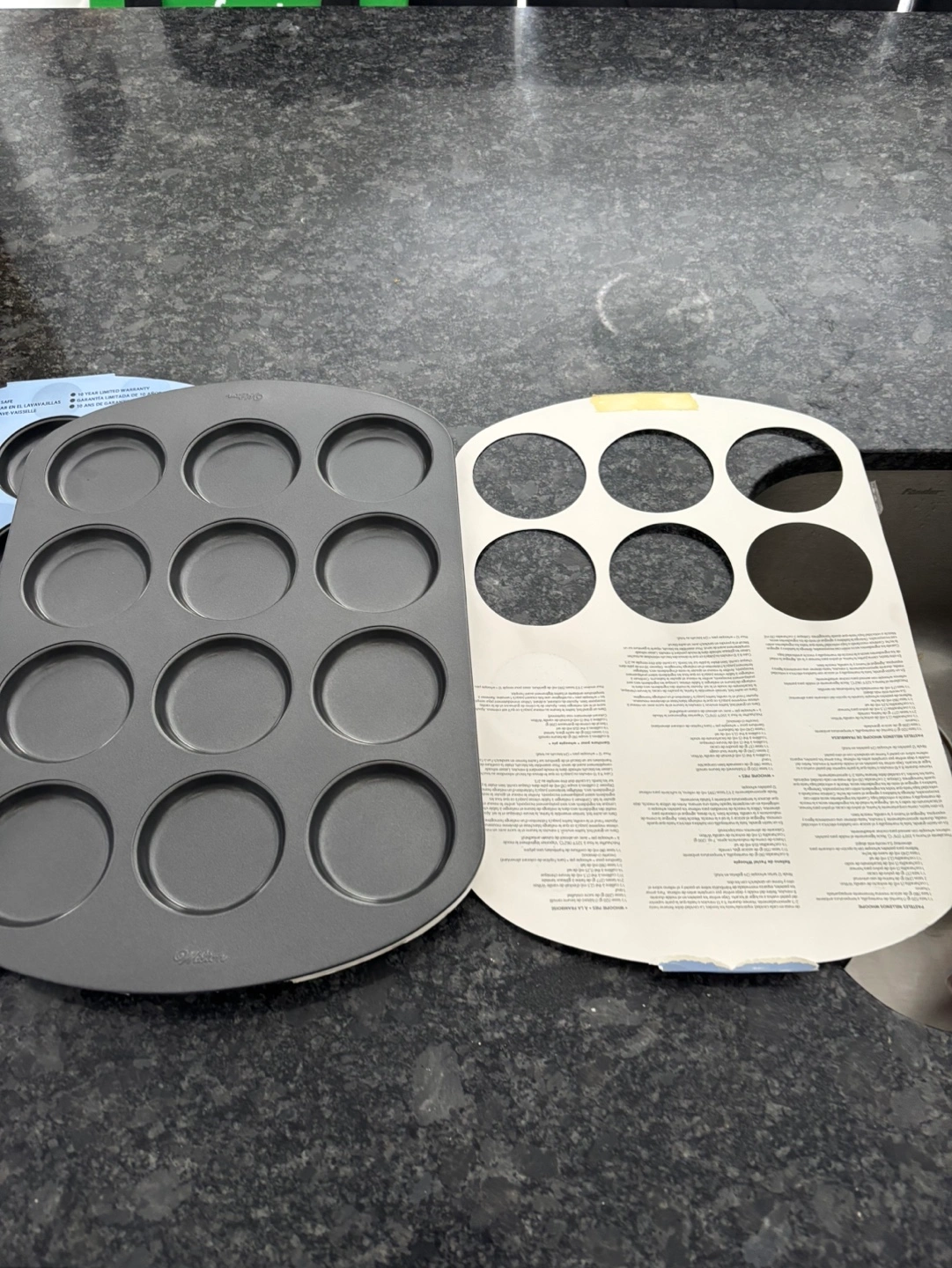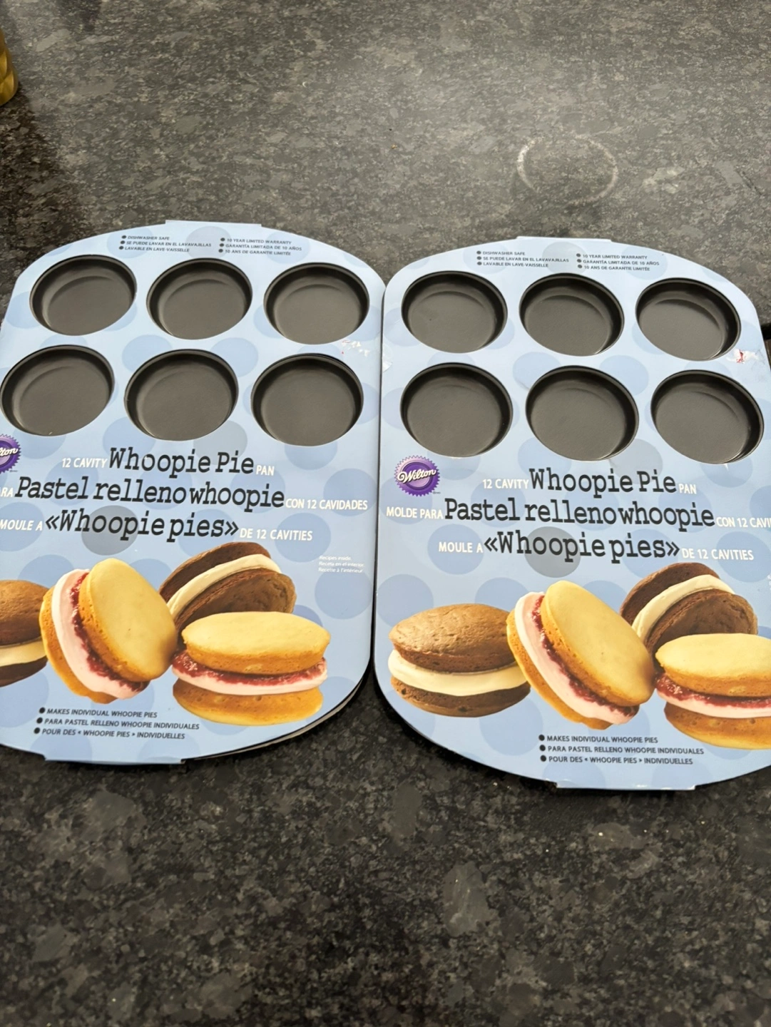 Two brand new Wilton 12-cavity whoopie pie pans. Makes individual whoopie pies. Also great for cookies and individual brownies cakes treats Dishwasher safe. Non-stick.