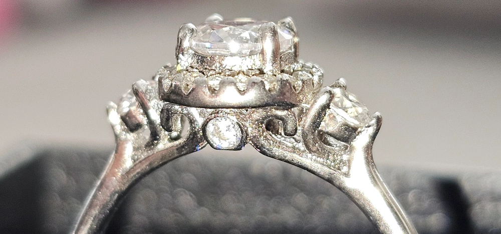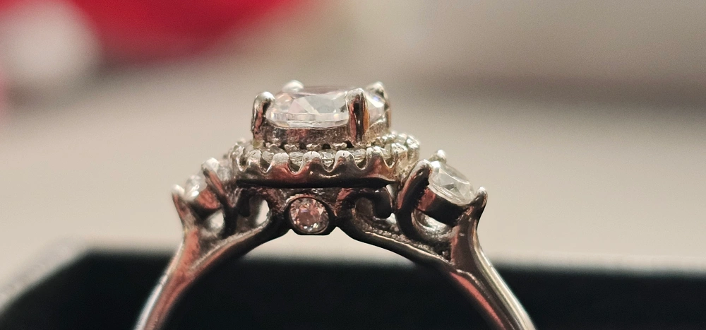 Beautiful sterling silver ring. Features a large halo-set cubic zirconia centre stone and two smaller accent stones. 925 stamped. Elegant design, perfect for any occasion.