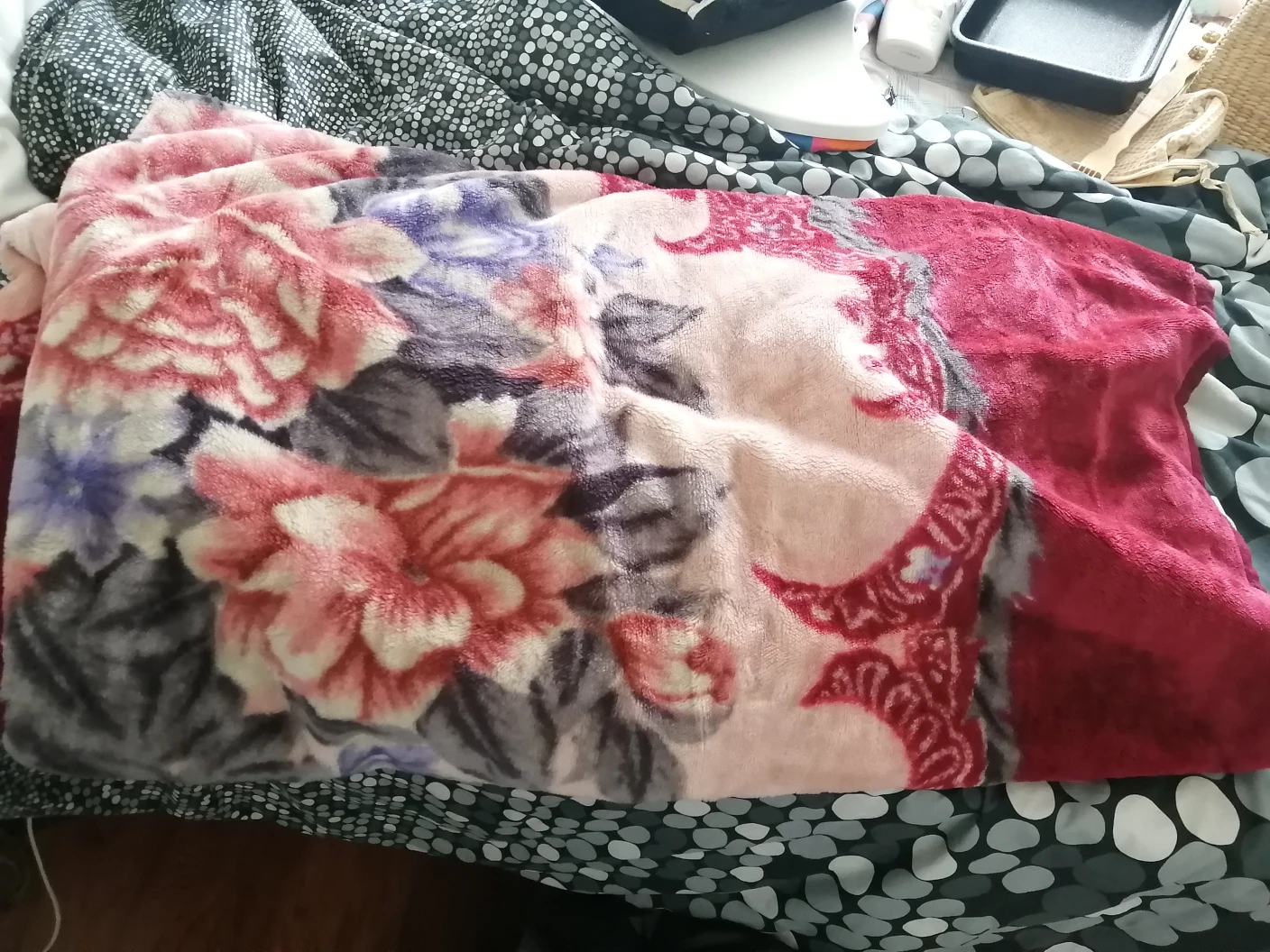 Soft fleece throw blanket. Features a floral design in shades of pink, red, and purple. Cozy and warm.
