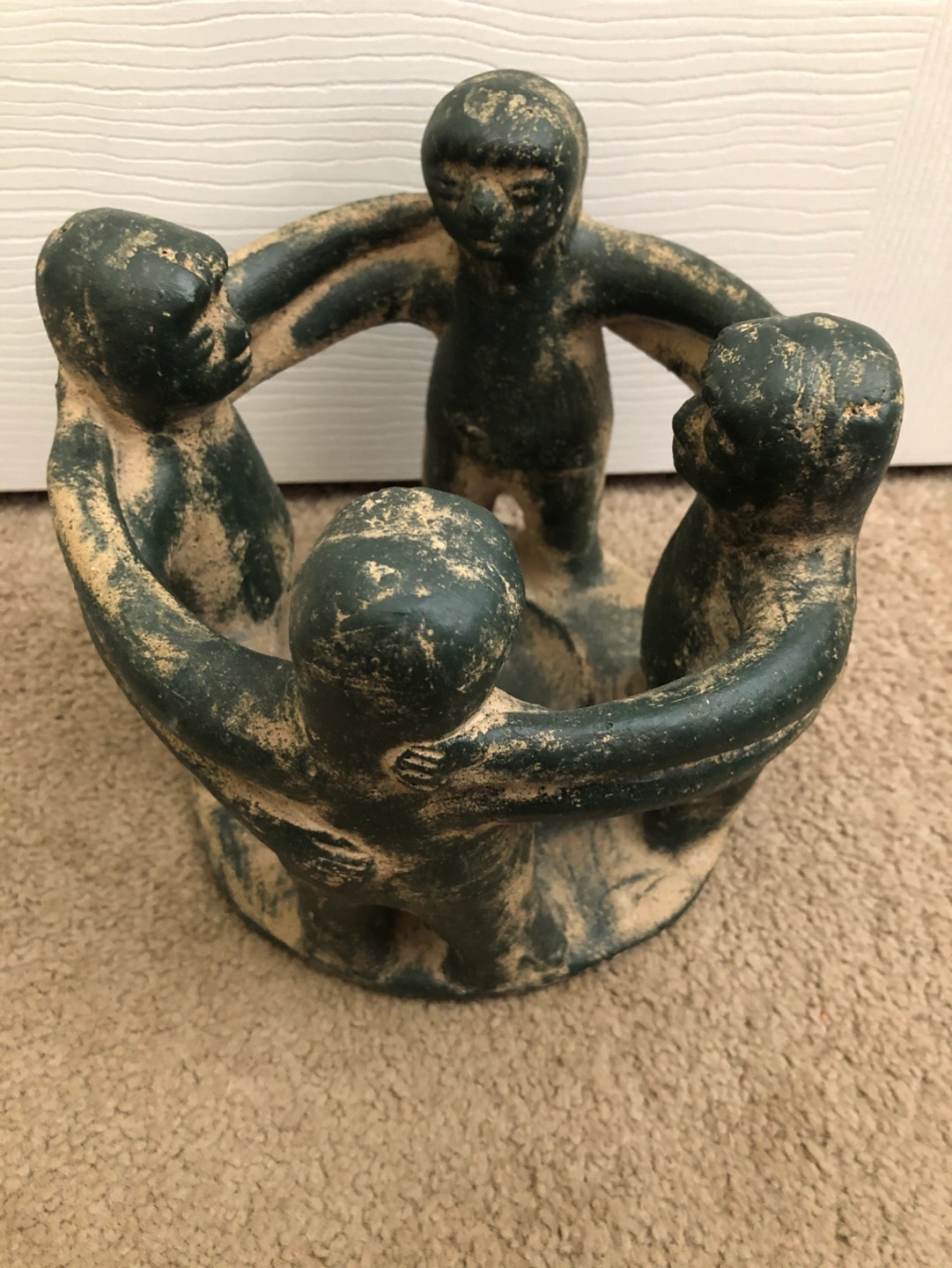 75Unique pottery candle holder. Four figures in a circle. Green and gold colours. 7 inches tall.