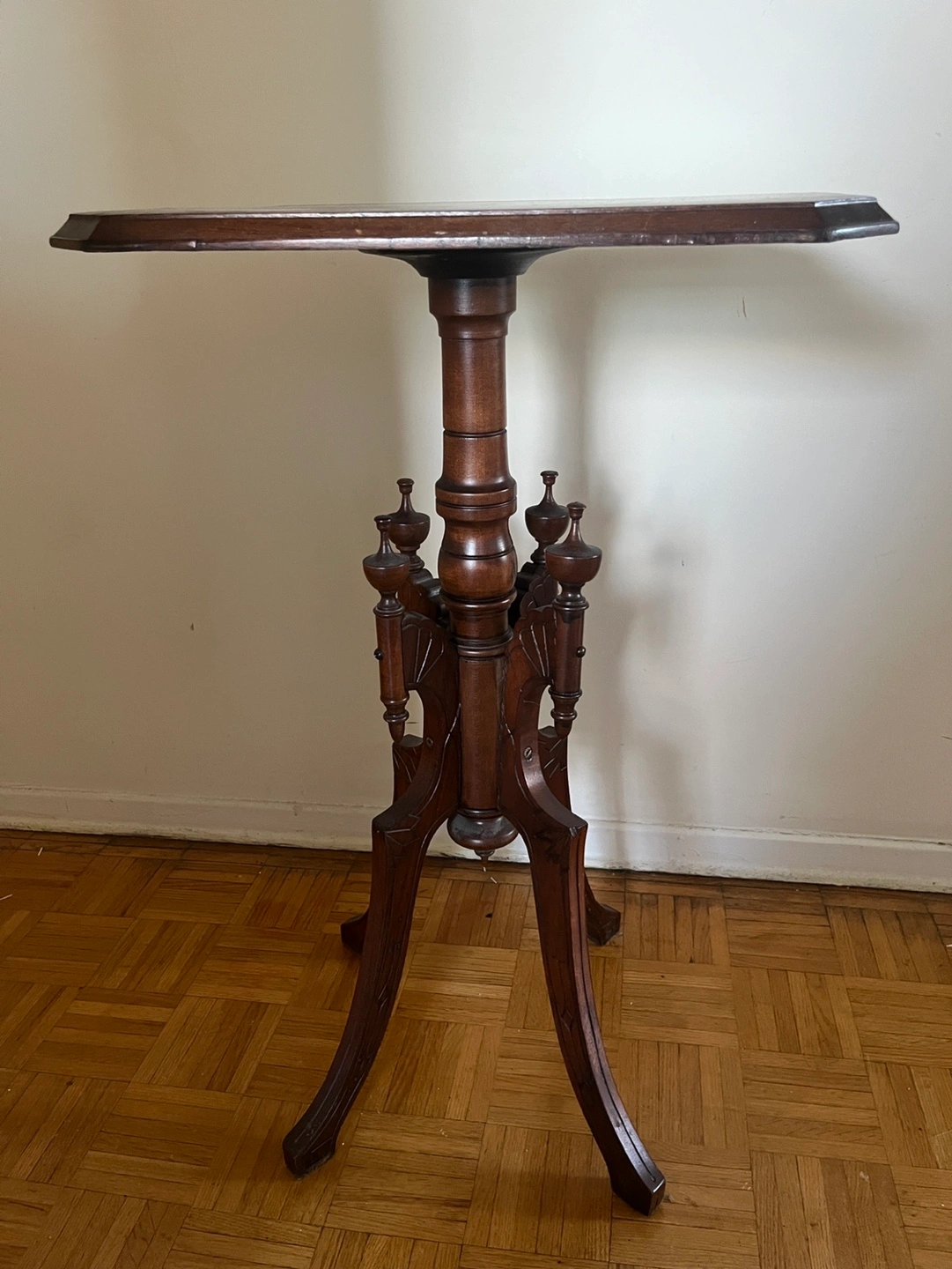 Bring timeless elegance into your home with this stunning antique Victorian-style side table. Featuring finely carved details, decorative finials, and a rich wood finish, this piece is perfect as a side table, plant stand, or decorative accent for any room.