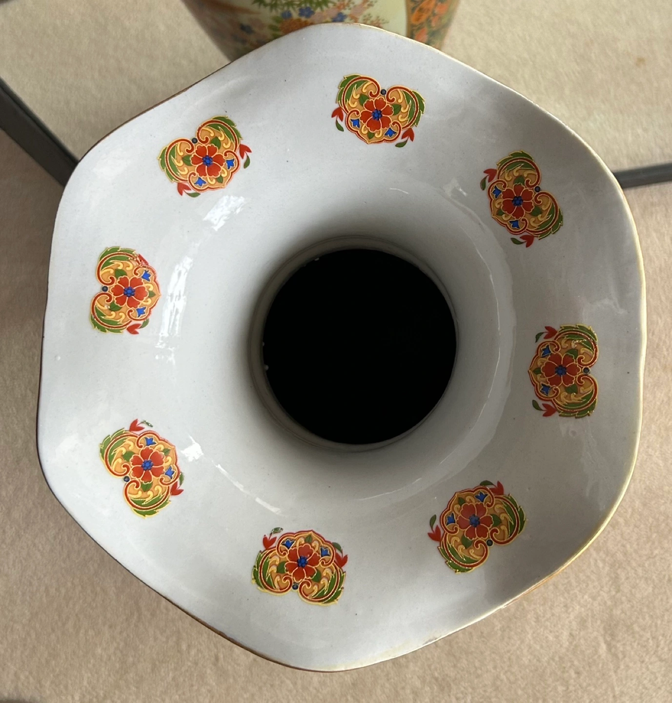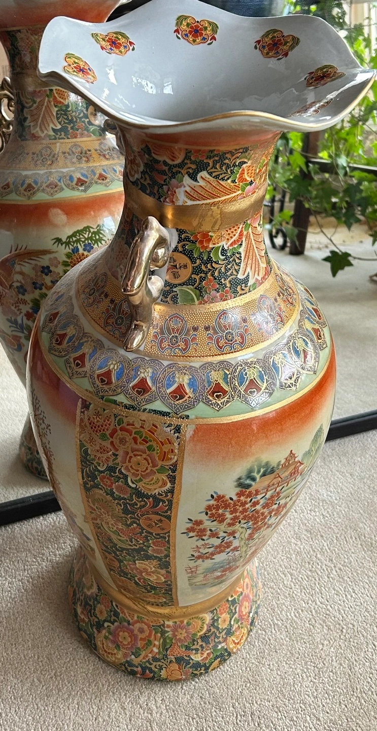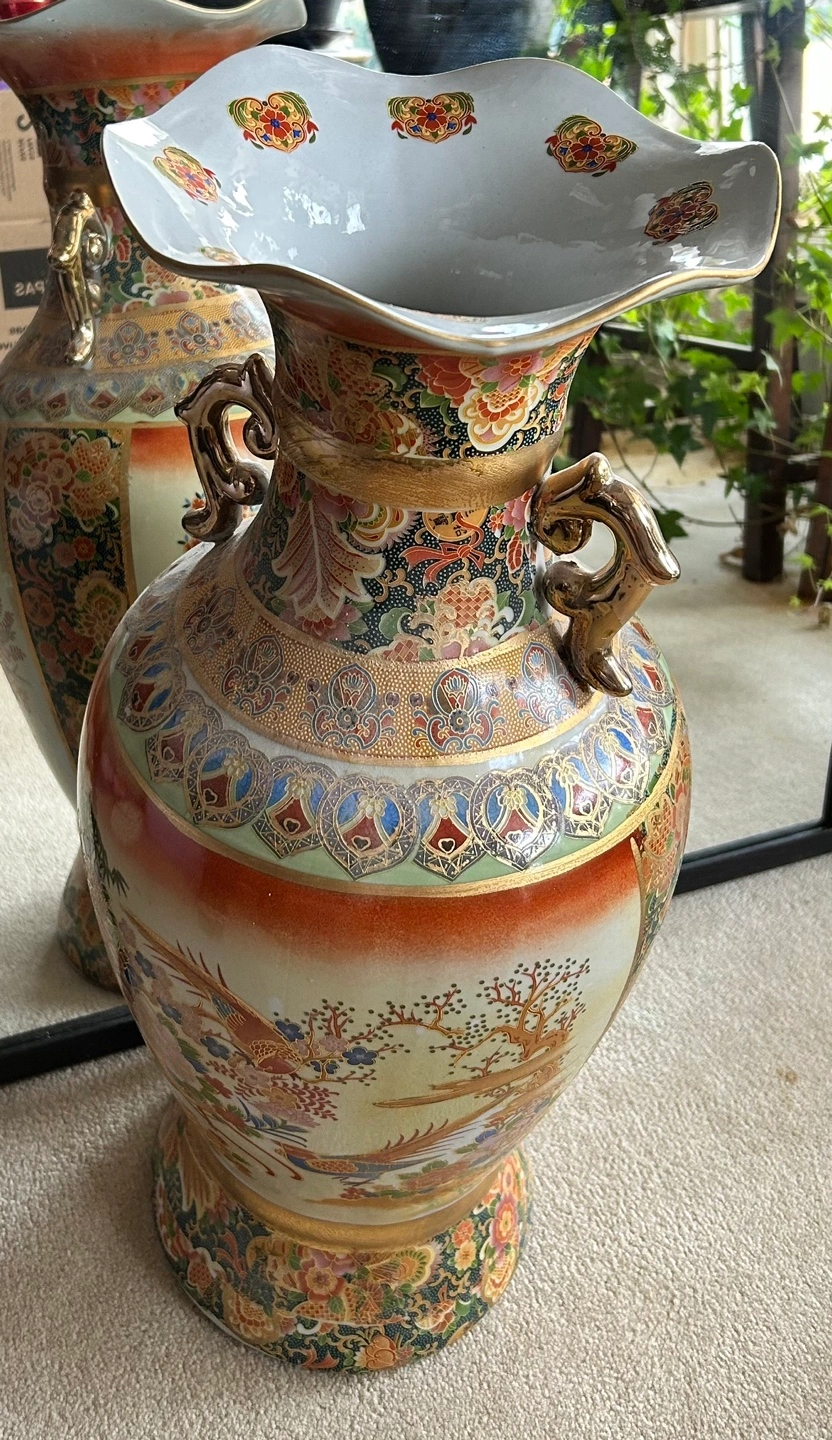Ornate porcelain vase. Features gold detailing and colourful floral and landscape patterns. Two ornate handles. Large size, perfect for a statement piece. 😊