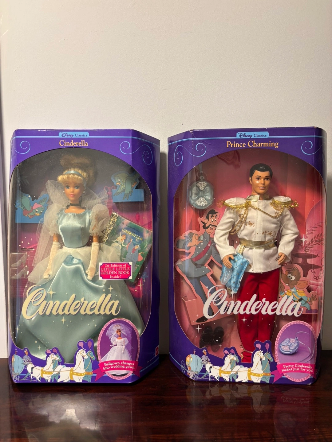 Collectible Disney Classics dolls. Cinderella and Prince Charming in original packaging. Includes accessories. A great addition to any Disney collection.