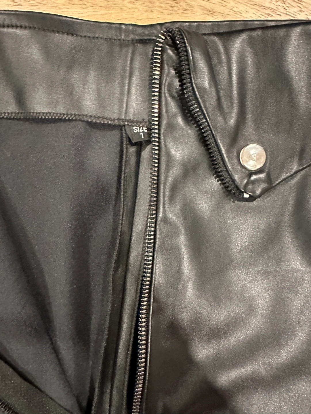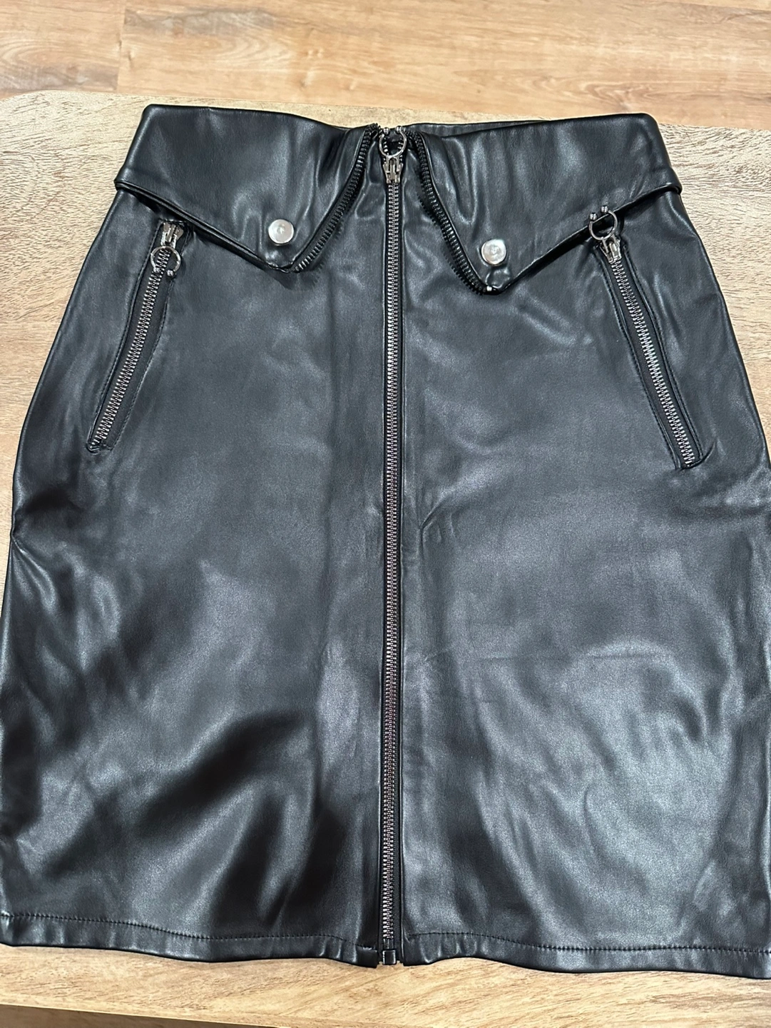 Stylish black faux leather mini skirt. Features a front zipper closure, zipper pockets, and a unique collar detail. Size 1 which fits small to medium