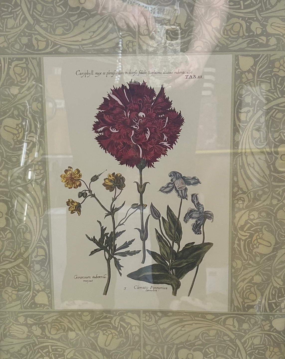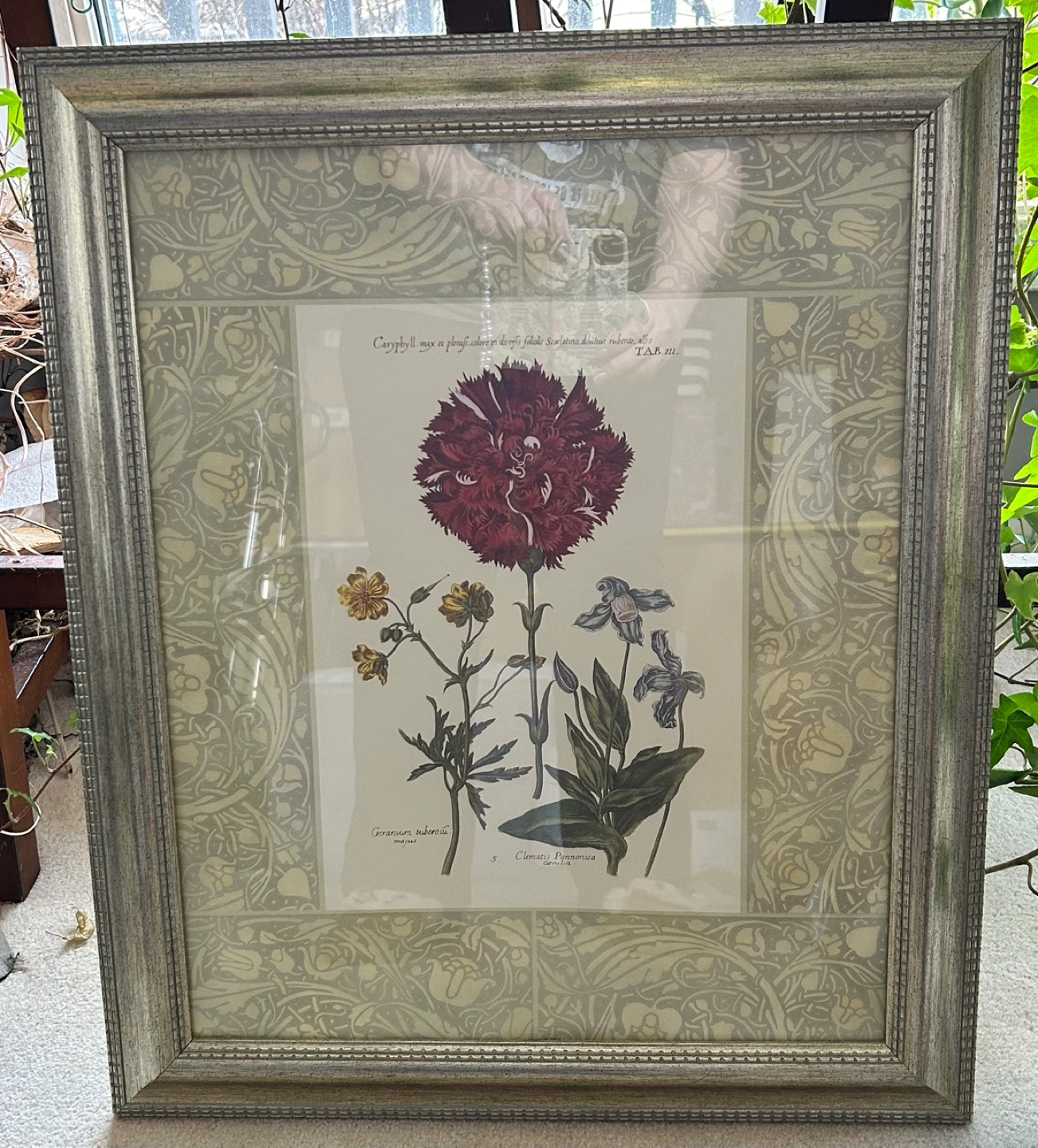 Beautiful framed botanical print. Features various flowers, including a prominent dark red carnation. Gold toned frame. Ready to hang. 20”X 24” 😊