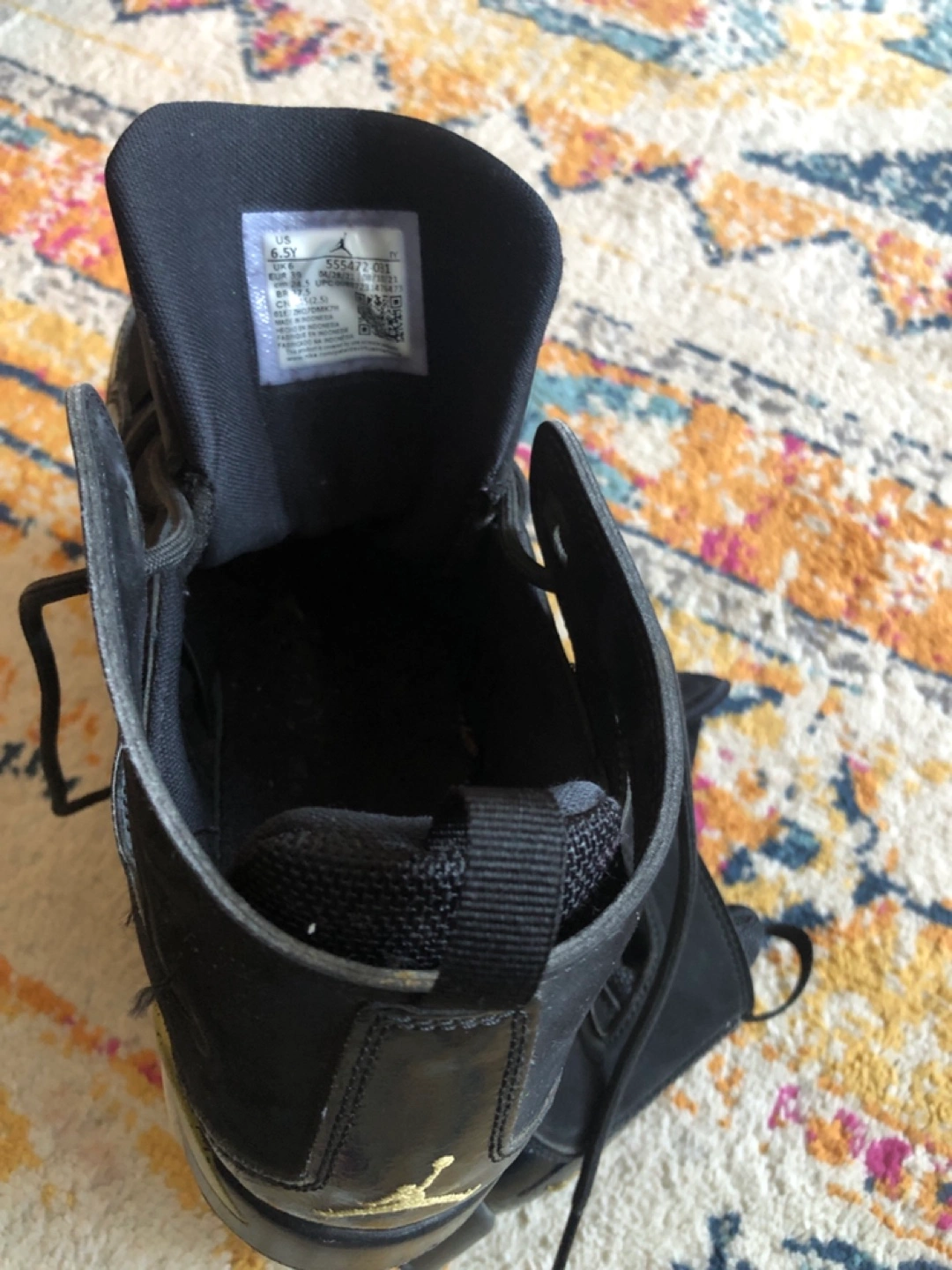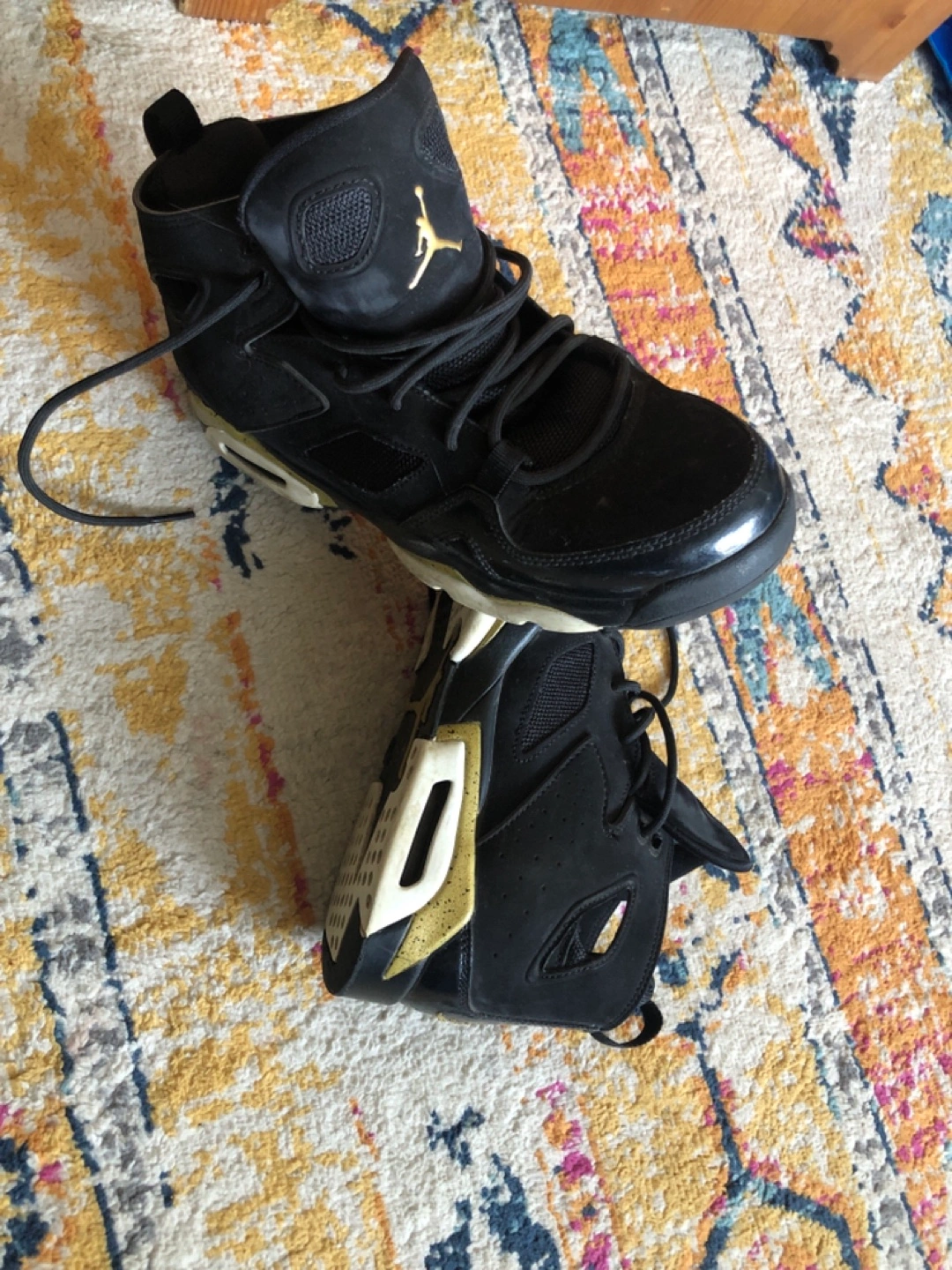 Pre-owned Air Jordan 6 Rings basketball shoes. Black and gold colourway. Size 6.5. Some wear .