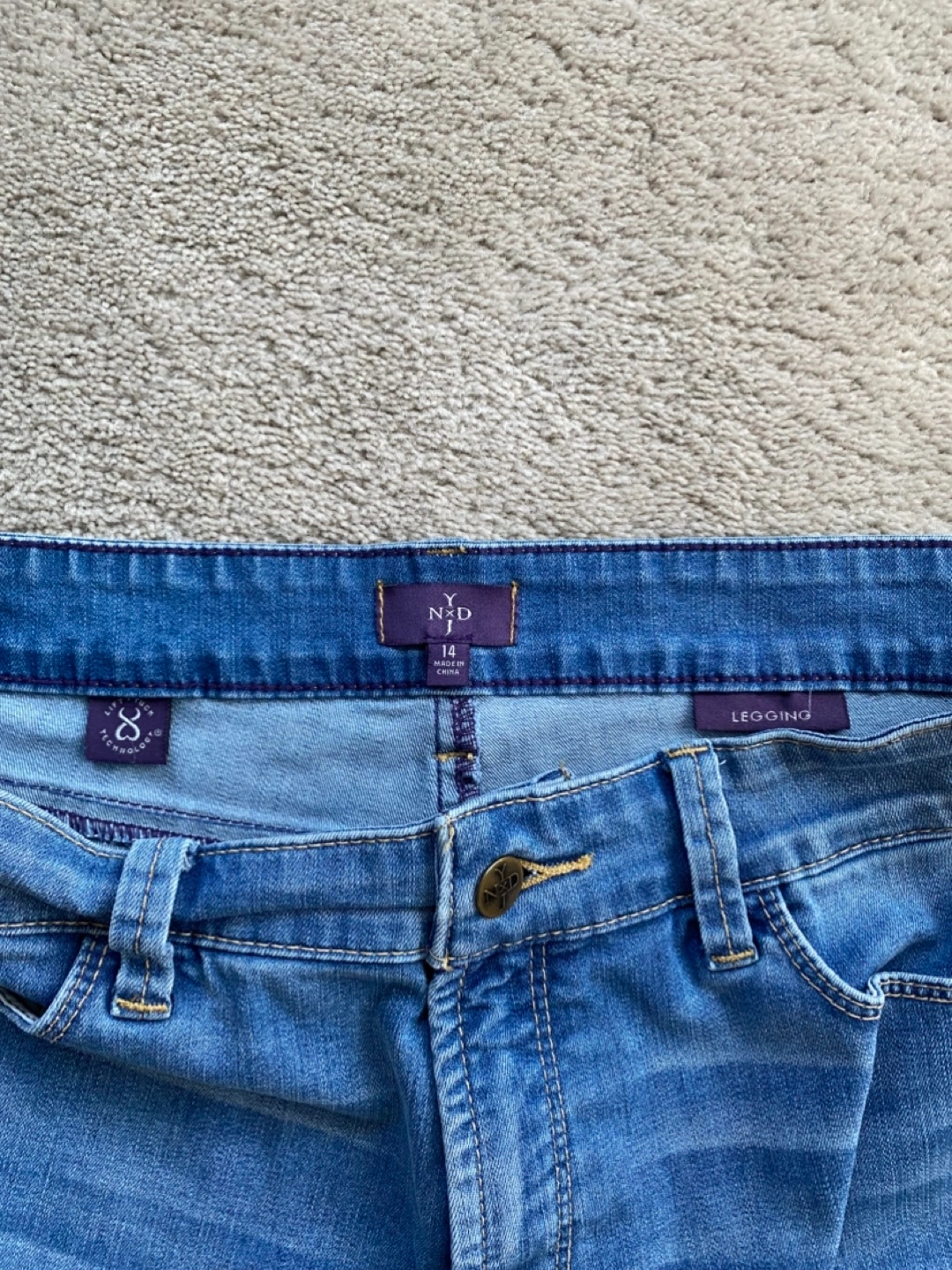45Women's light wash denim leggings. Size 14. Excellent condition. Straight leg style. Machine washable. Pick up in Sundance.