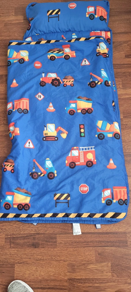 Blue nap mat featuring construction vehicles. Includes attached pillow. Soft and comfortable. Perfect for preschool or daycare.