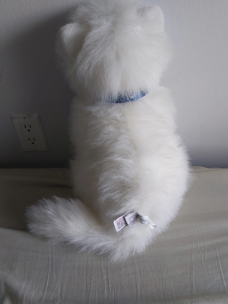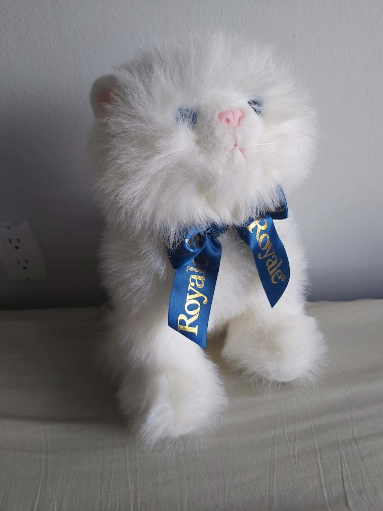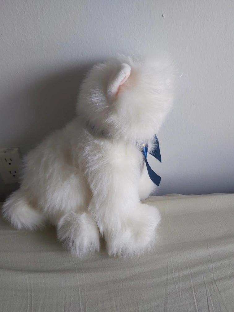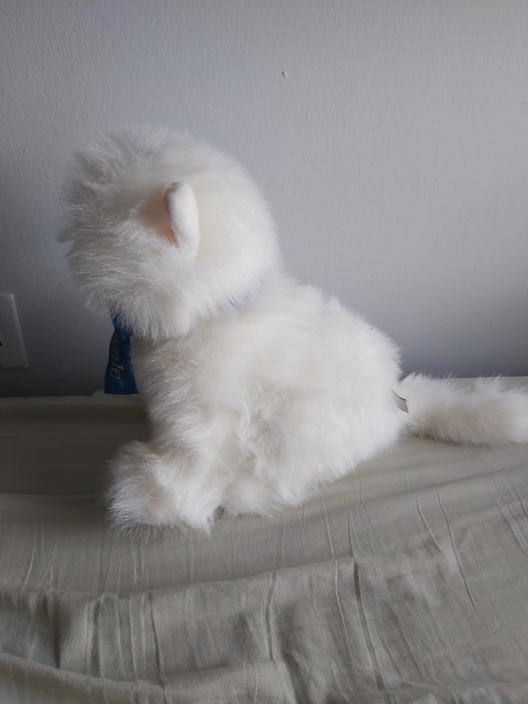 20Adorable white plush kitten. Soft fur. Blue ribbon around neck. Collectible.