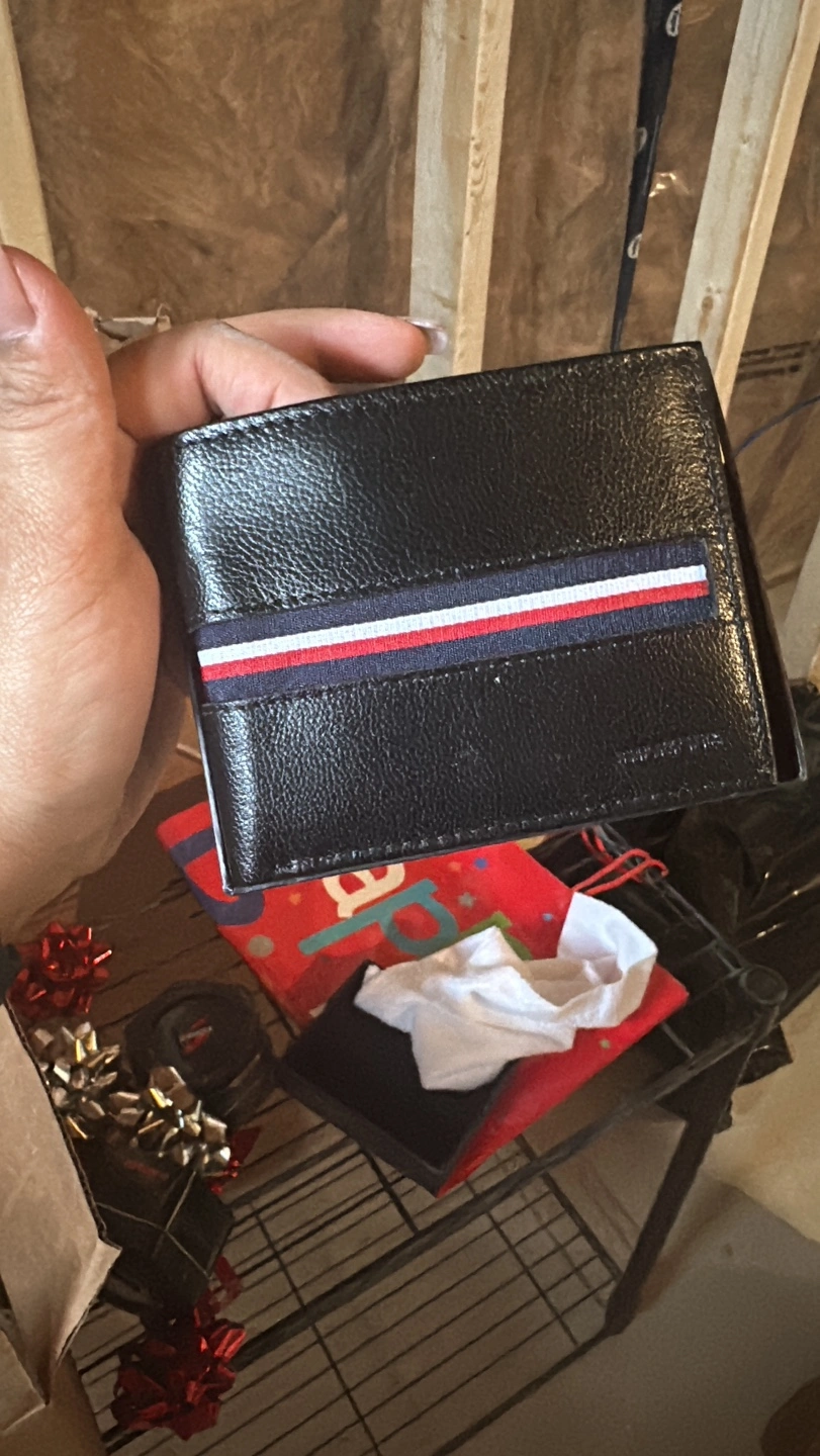 Brand new in box. Black leather bi-fold wallet. Features a signature tricolor stripe. Slim and compact design.