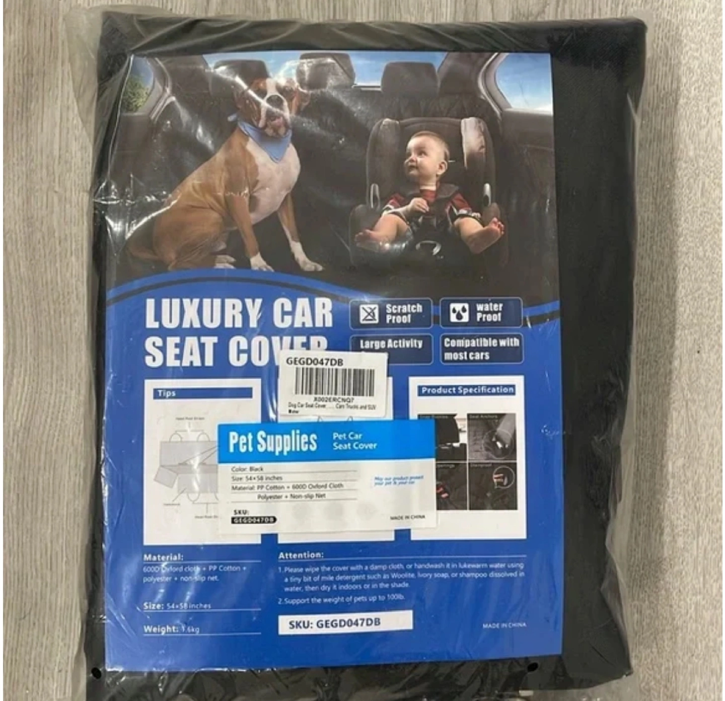 Luxury car seat cover. Scratch and water proof. Compatible with most cars. Made of PP cotton, 600D Oxford cloth, polyester and non-slip net. Size: 54 x 58 inches. Black colour. New.