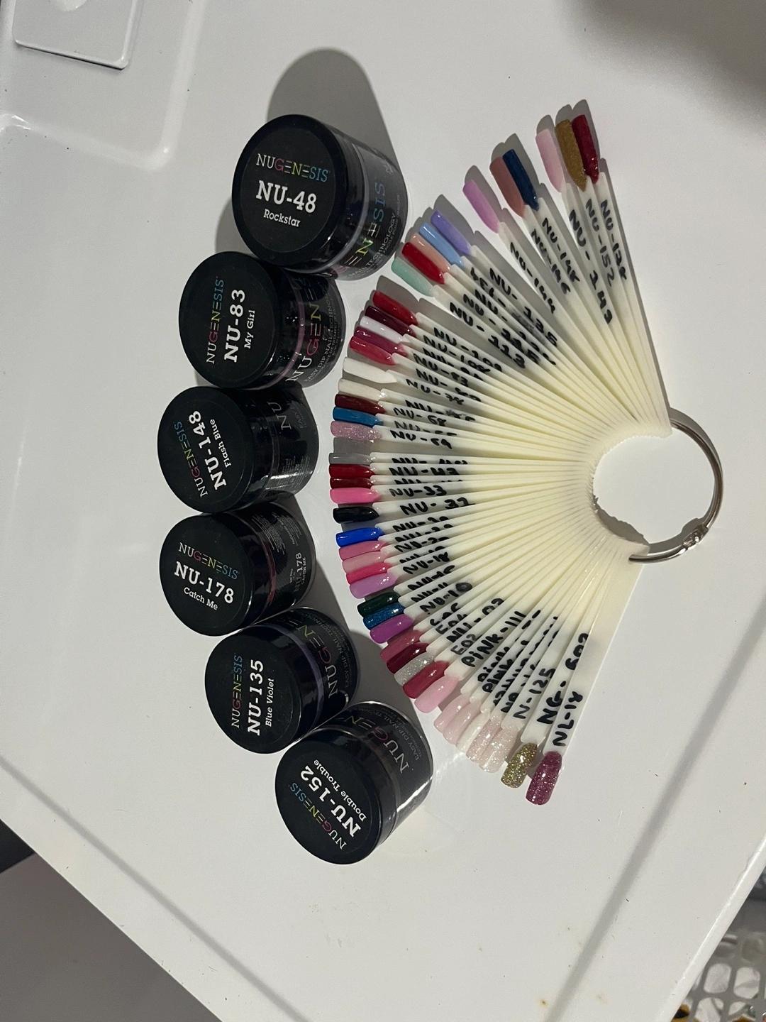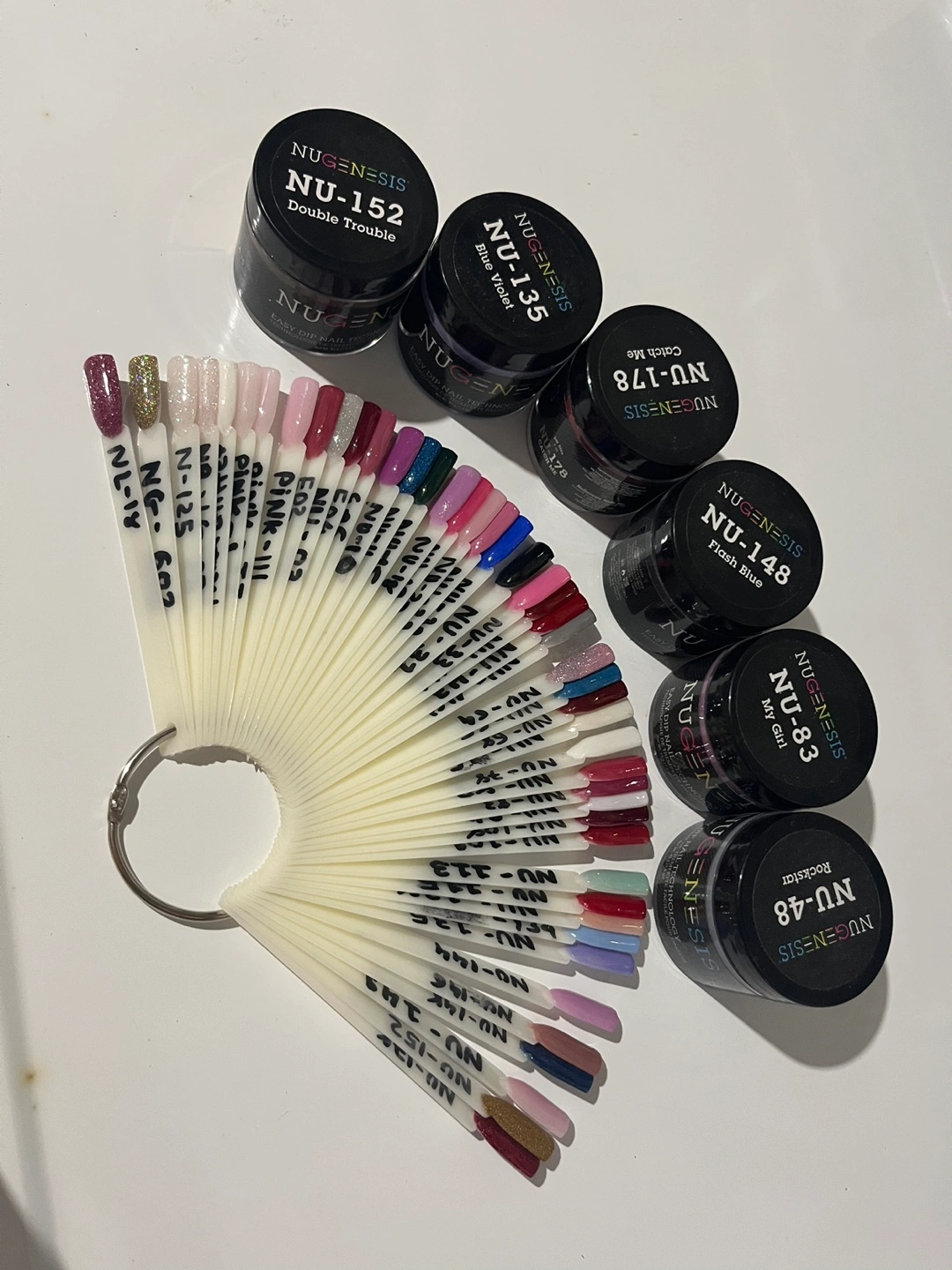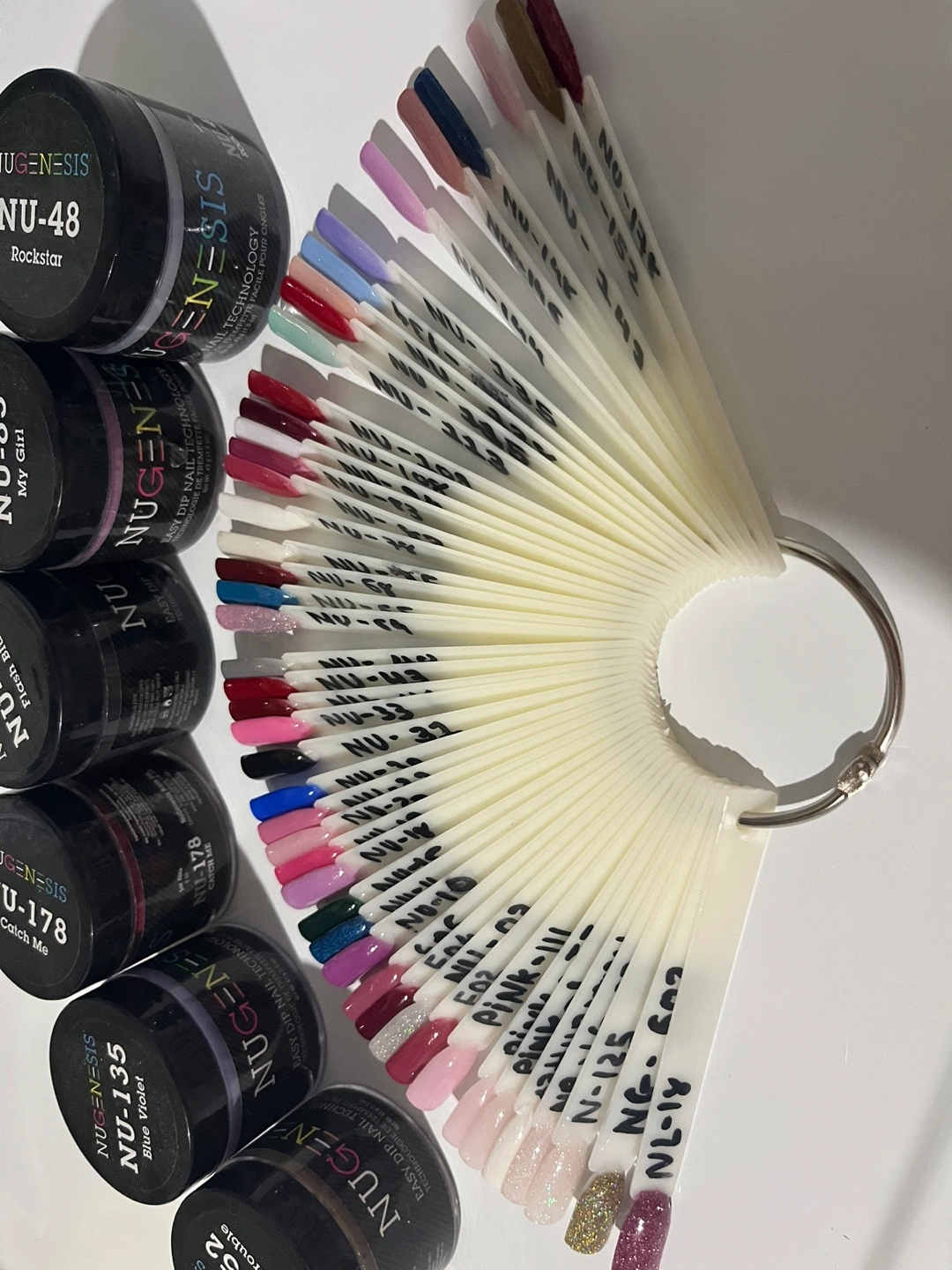 Collection of NUGENESIS nail powder jar.Various colours included. Colour chart displays full range. Perfect for nail technicians or enthusiasts.all new each 18$ if you buy 10 each 15$