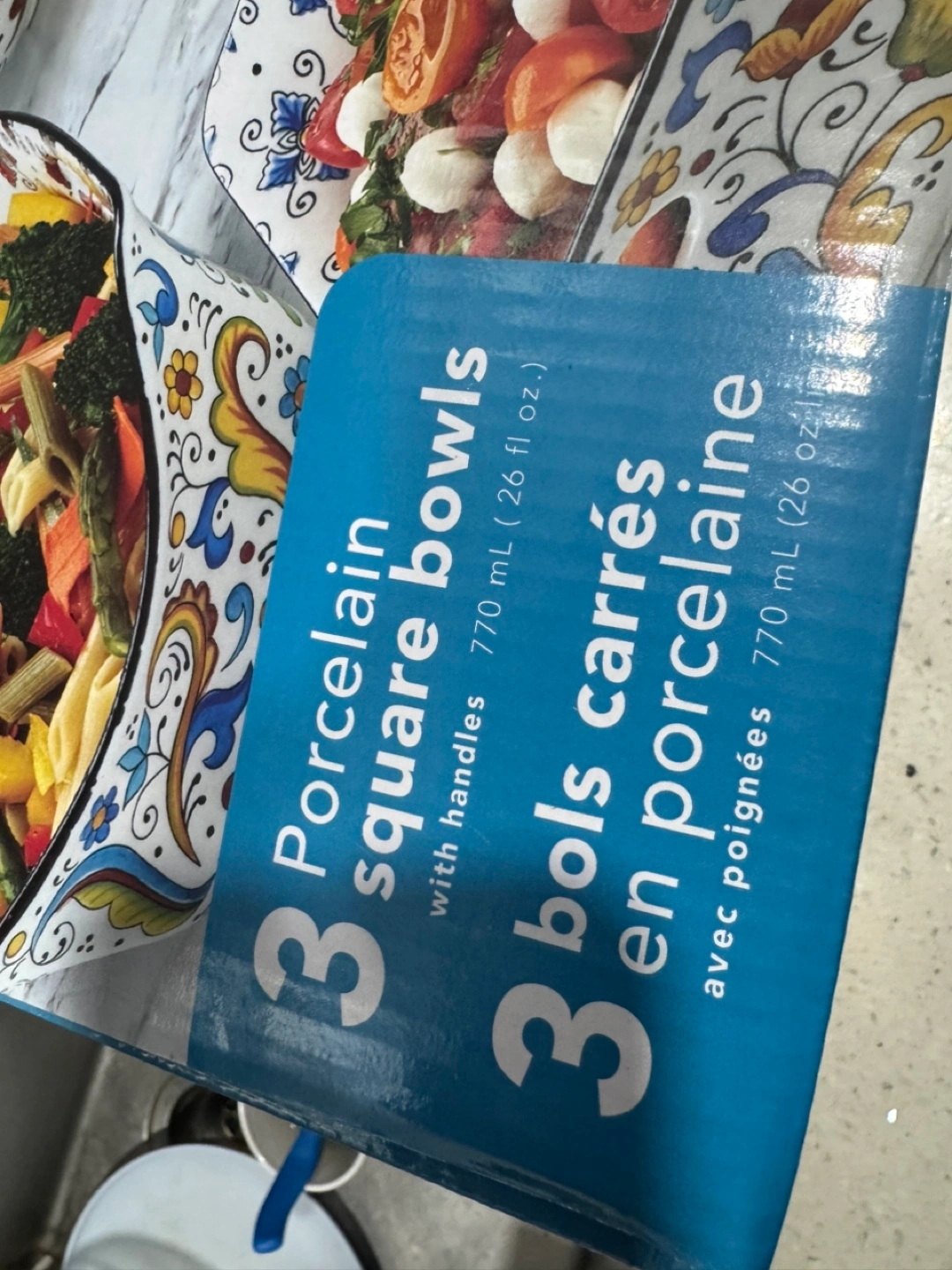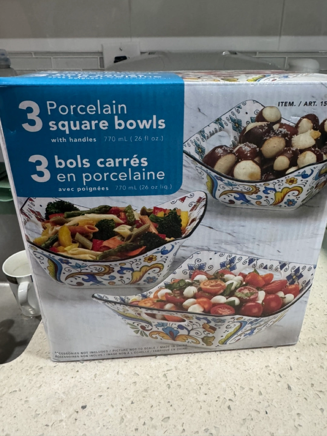 79Set of three porcelain square bowls. Each bowl features handles and colourful floral design. Microwave and dishwasher safe. Not oven safe.