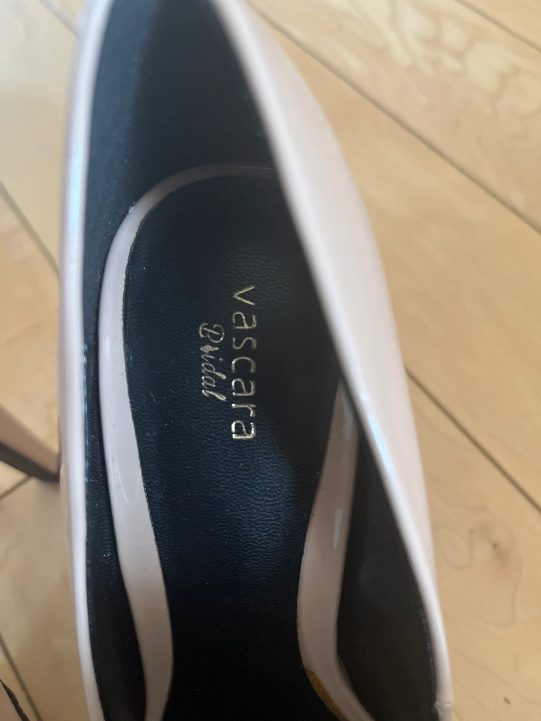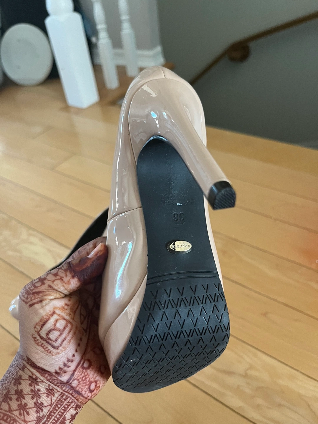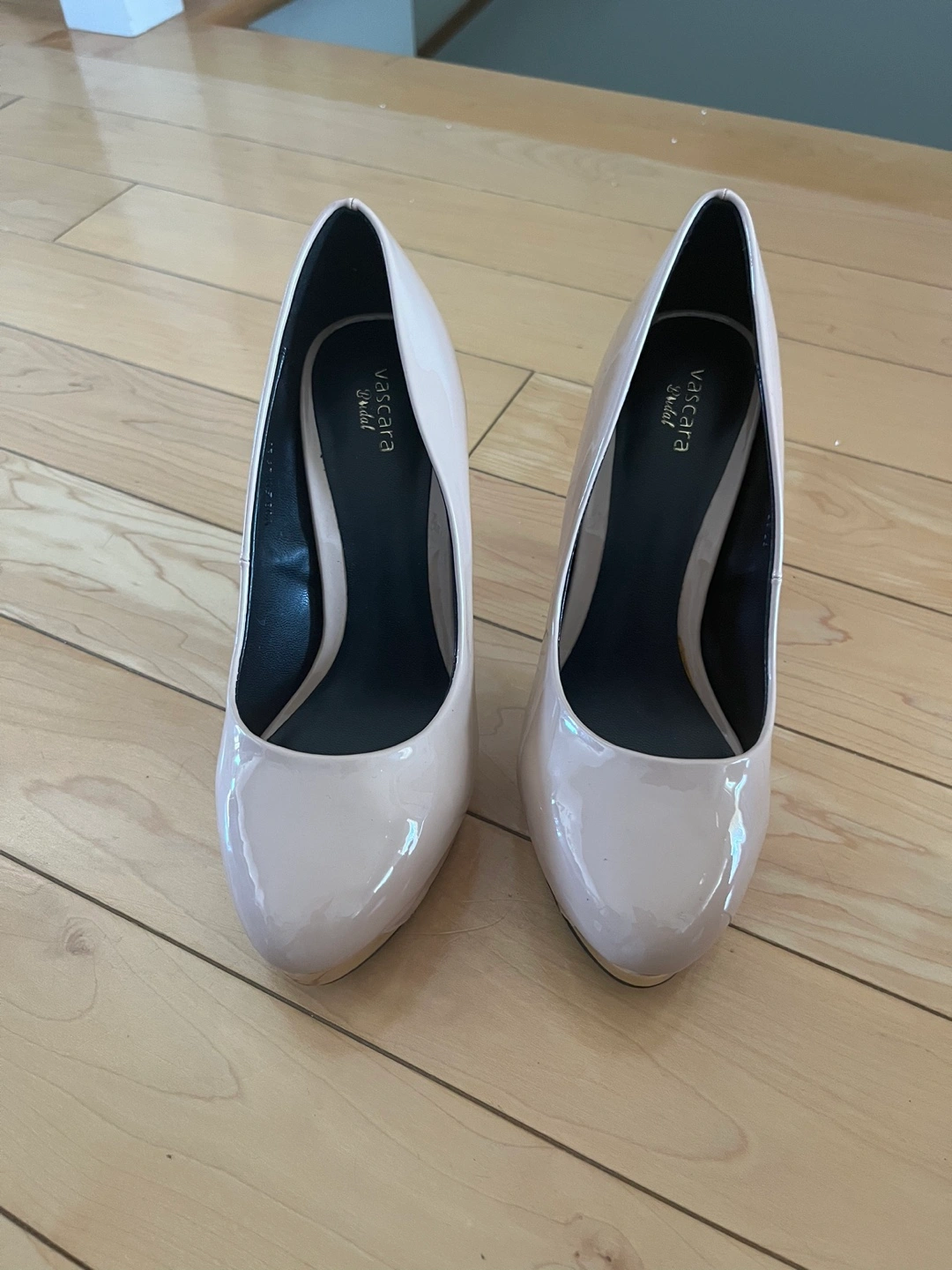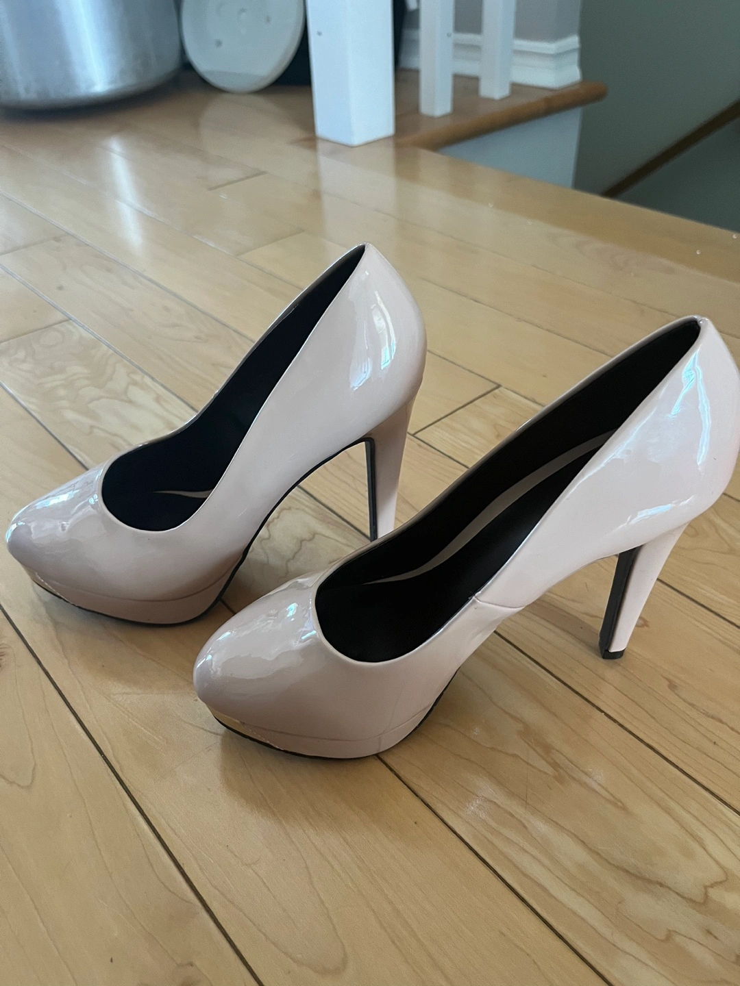 Nude patent leather pumps. High heels. Slight platform. Gold accents. Size 6.