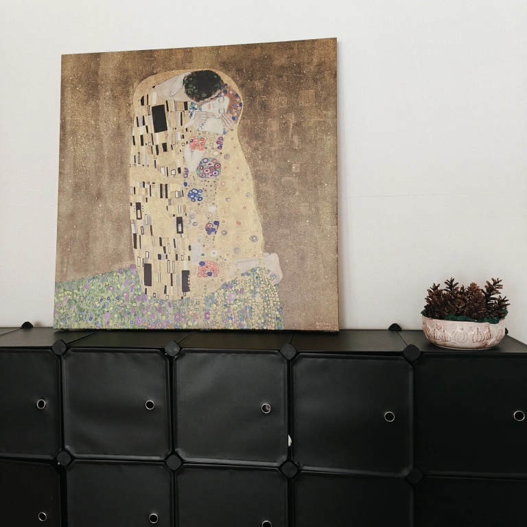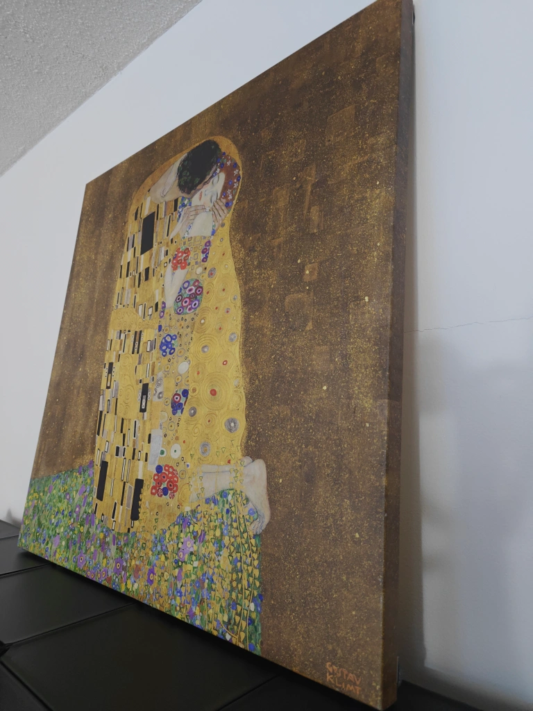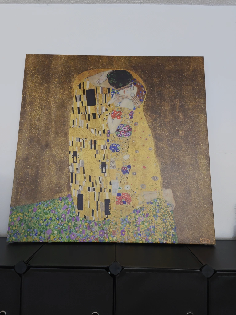 Large canvas print of Gustav Klimt's The Kiss. Gold background, vibrant colours. Perfect for adding a touch of art to your home. Excellent condition (like new).