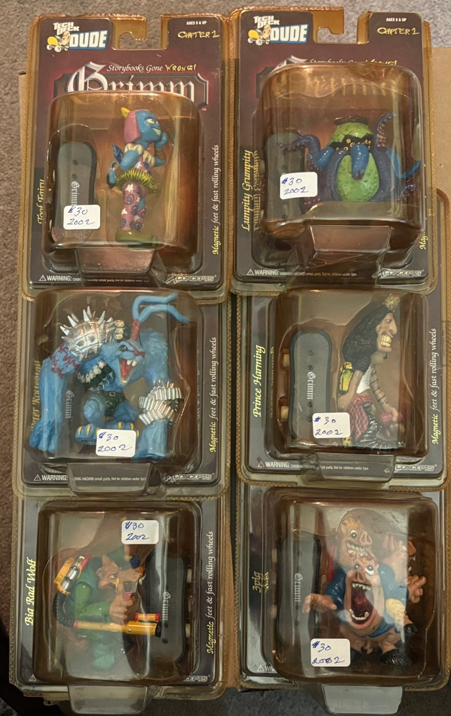 Six Tech Deck Dude Grimm figures. Storybooks Gone Wrong! Collectible figurines with magnetic feet & rolling wheels. Ages 9 & up. Includes Lumpity Grumpity, Prince Harming, 3pig, Toof Terry, Big Bad Wolf, and Peter Rottentail.