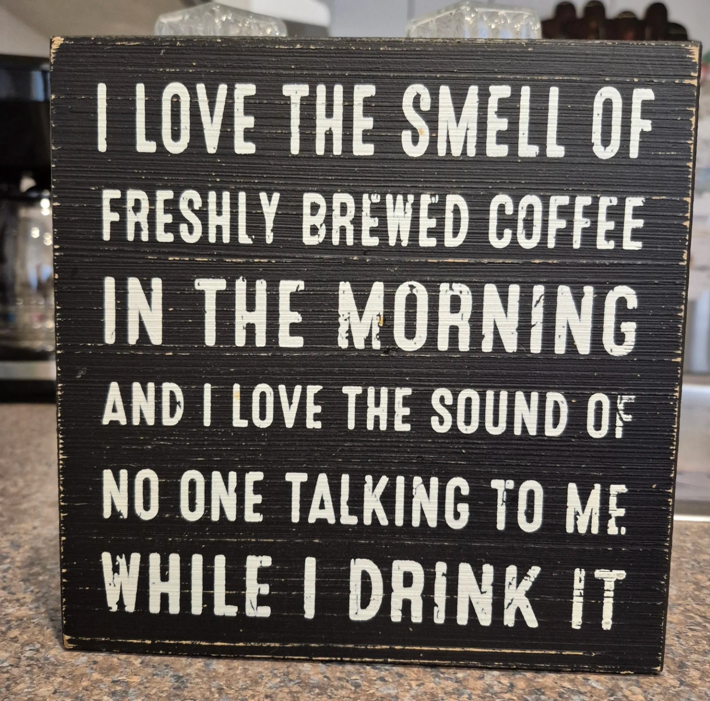 A rustic 8" square wooden sign with a funny coffee quote. "I love the smell of freshly brewed coffee in the morning and I love the sound of no one talking to me while I drink it." It's made of wood and has a black painted finish with white lettering. 1.5" wide edge