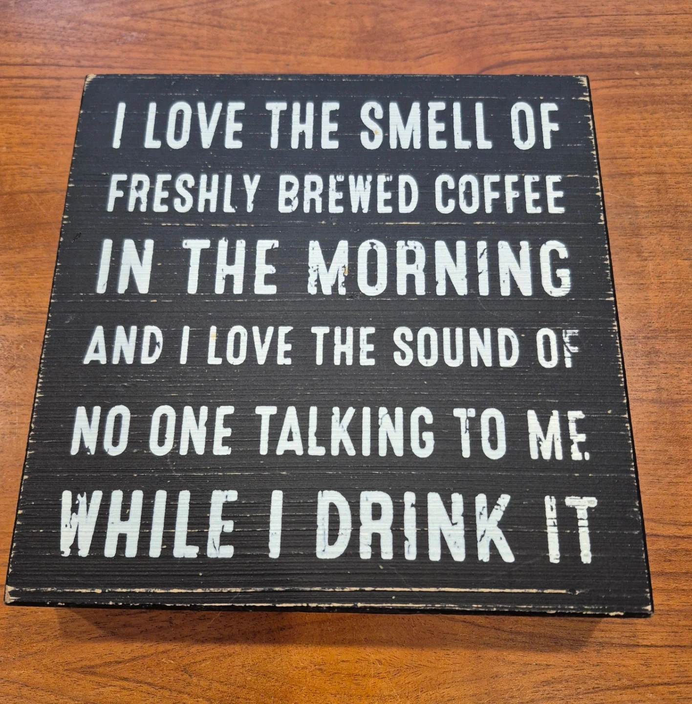 A rustic 8" square wooden sign with a funny coffee quote. "I love the smell of freshly brewed coffee in the morning and I love the sound of no one talking to me while I drink it." It's made of wood and has a black painted finish with white lettering. 1.5" wide edge