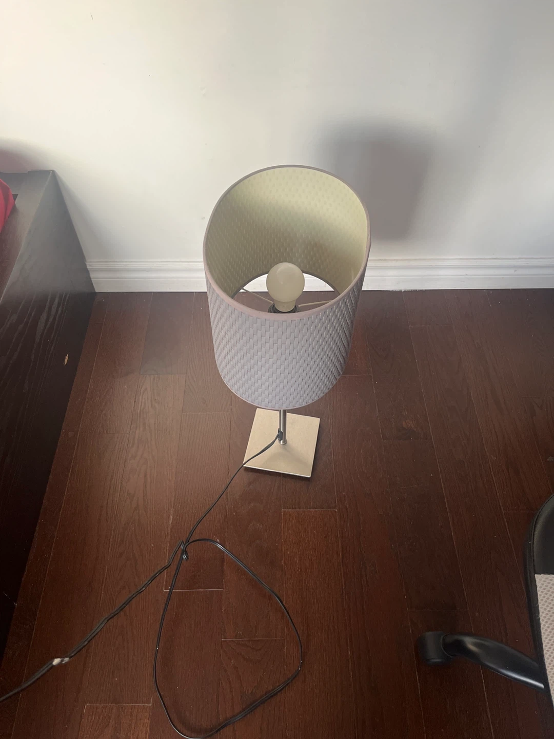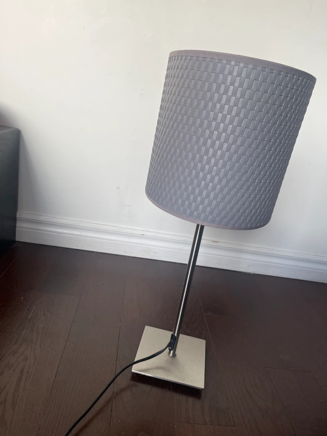 This is a modern table lamp with a grey woven shade. It features a brushed metal base and stem. Comes with a light bulb. Great for adding ambient light to any room!