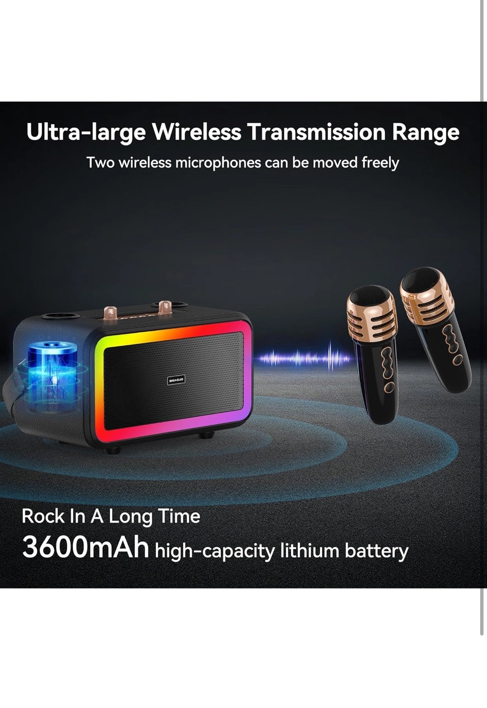 Portable karaoke speaker. Features two wireless microphones, colour-changing LED lights, and multiple connectivity options. Rechargeable battery. Great for parties and karaoke.