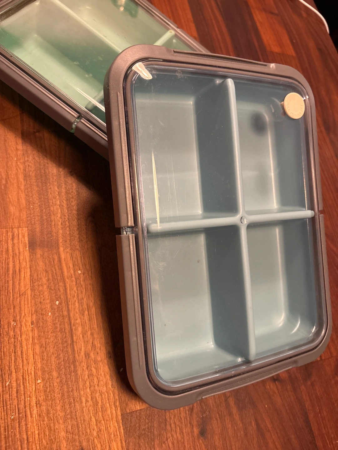 Reusable plastic bento box. Four compartments with tight sealing lid and freshness seal. Great for packing lunches or snacks. Two available (teal and blue). $10 each or both for $15.