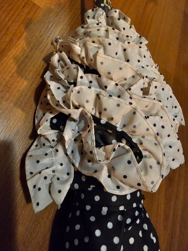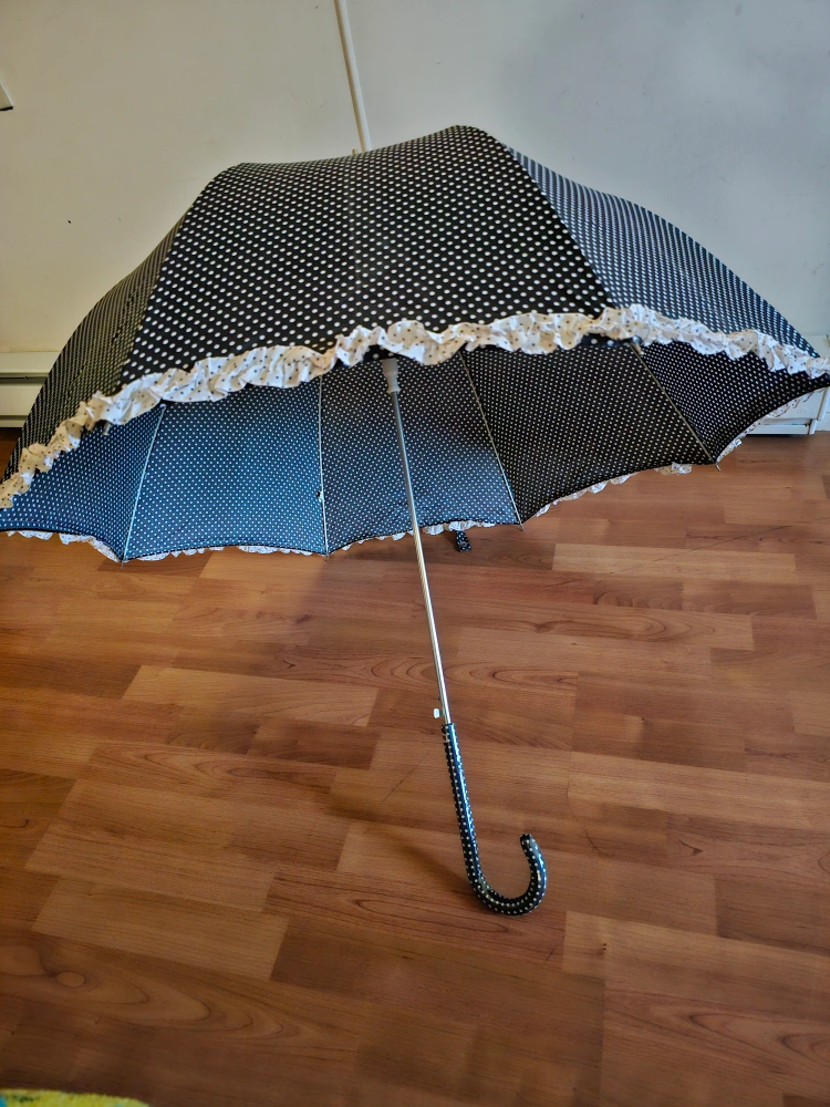 Black and white polka dot parasol umbrella. Features a cream coloured lace trim. Silver metal and covered handle that opens smoothly. Excellent used condition! π