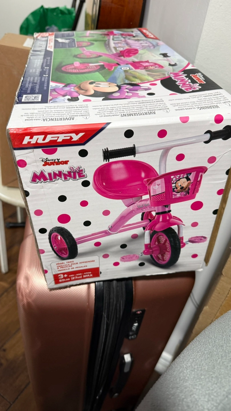 Pink Minnie Mouse tricycle. New in box (unopened). Suitable for children aged 3+. Features easy assembly, comfortable seat, and functional handlebar. Pedal trike with removable pedals.
