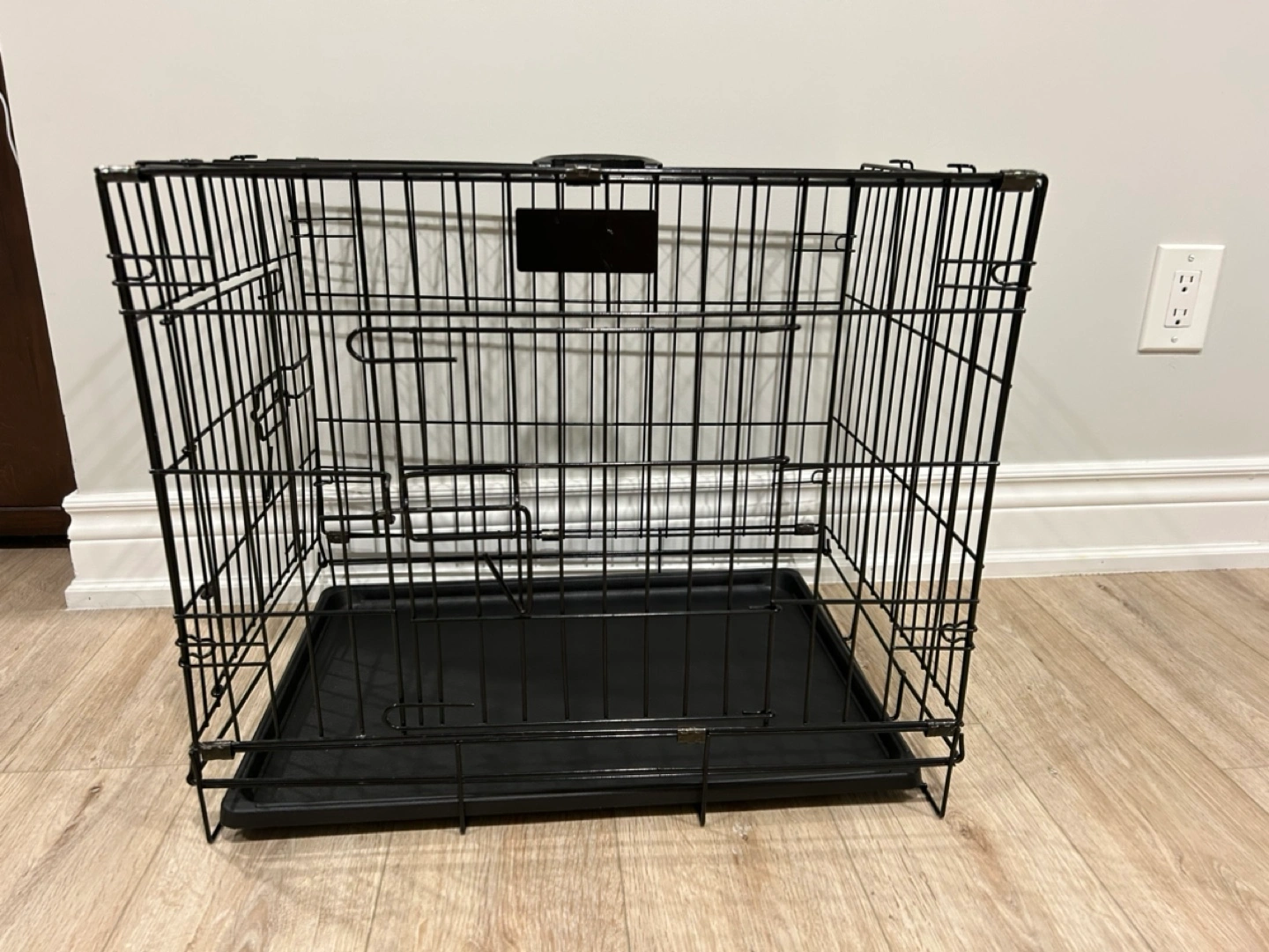 Collapsible wire dog crate. Black metal frame. Plastic tray. Folds flat for storage.