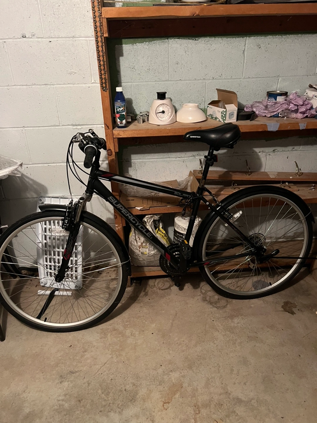 Black hybrid bicycle. 21 speeds. Good condition. Used.