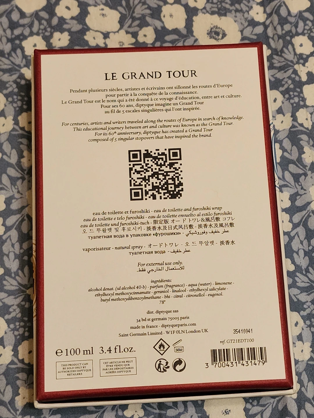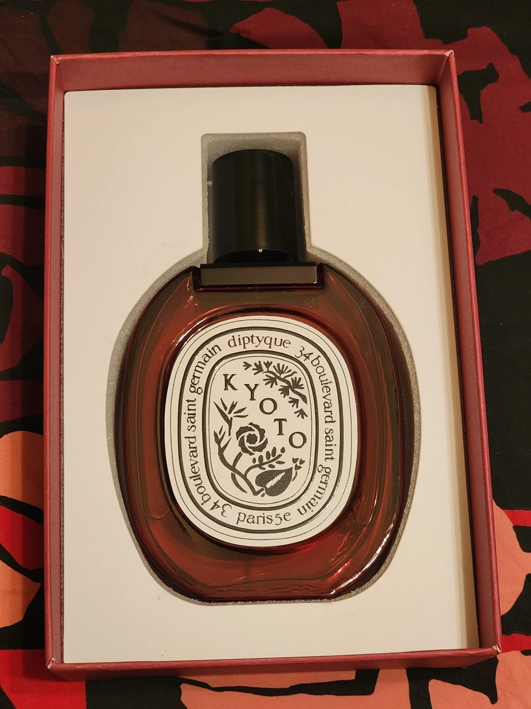 Presented in the furoshiki tradition, the bottle is wrapped in a fabric printed with the Sarayi pattern created by diptyque's founders.