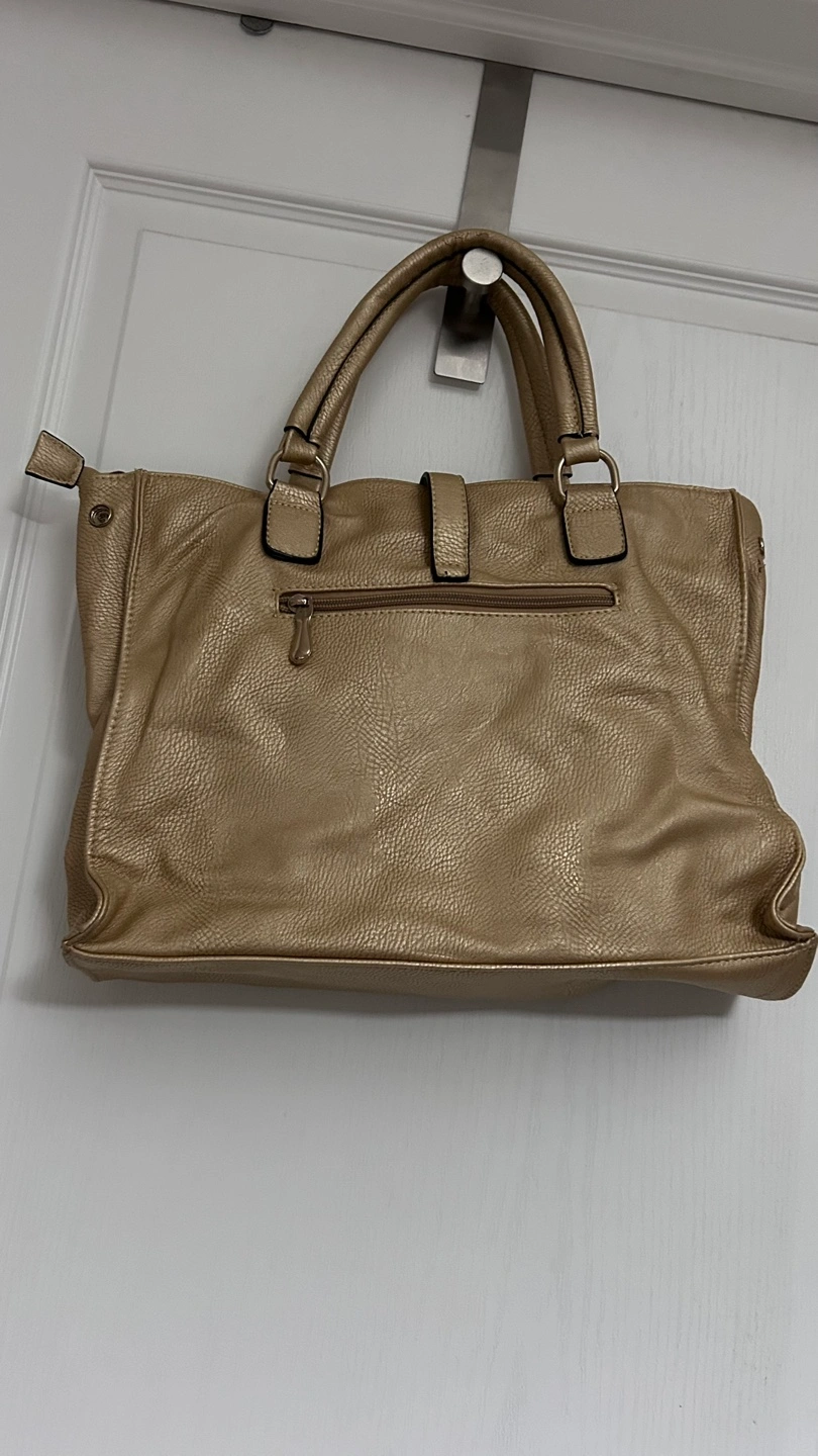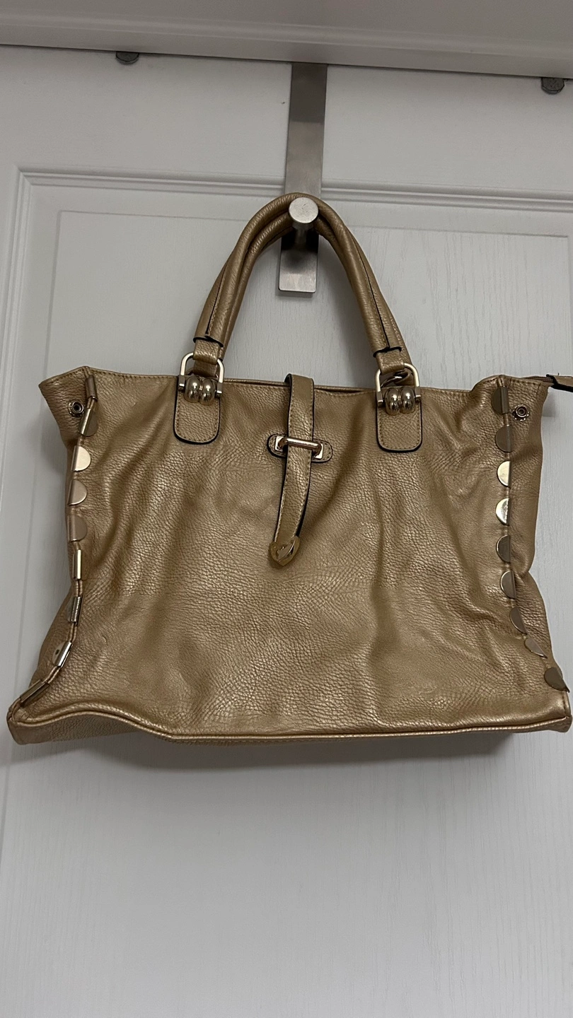 Stylish gold-tone handbag. Features two top handles, a zip closure, and decorative metallic accents. Great for everyday use.