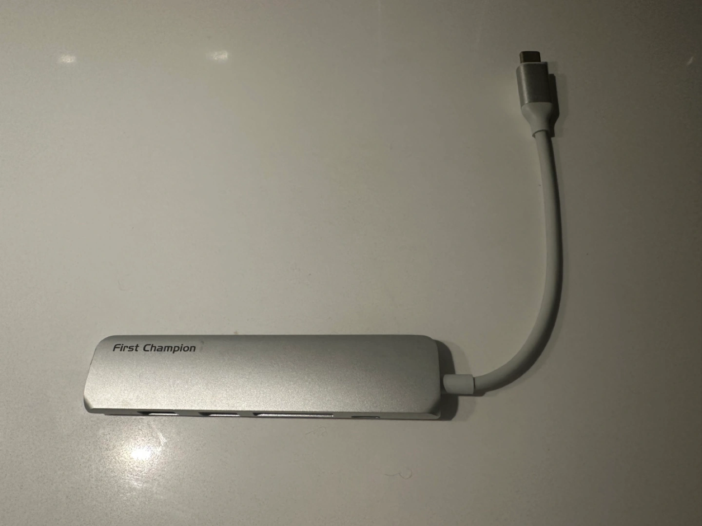 Silver USB-C hub. Features multiple ports including USB 3.0, SD card reader, and more. Compact and portable design. Great for expanding your device's connectivity.